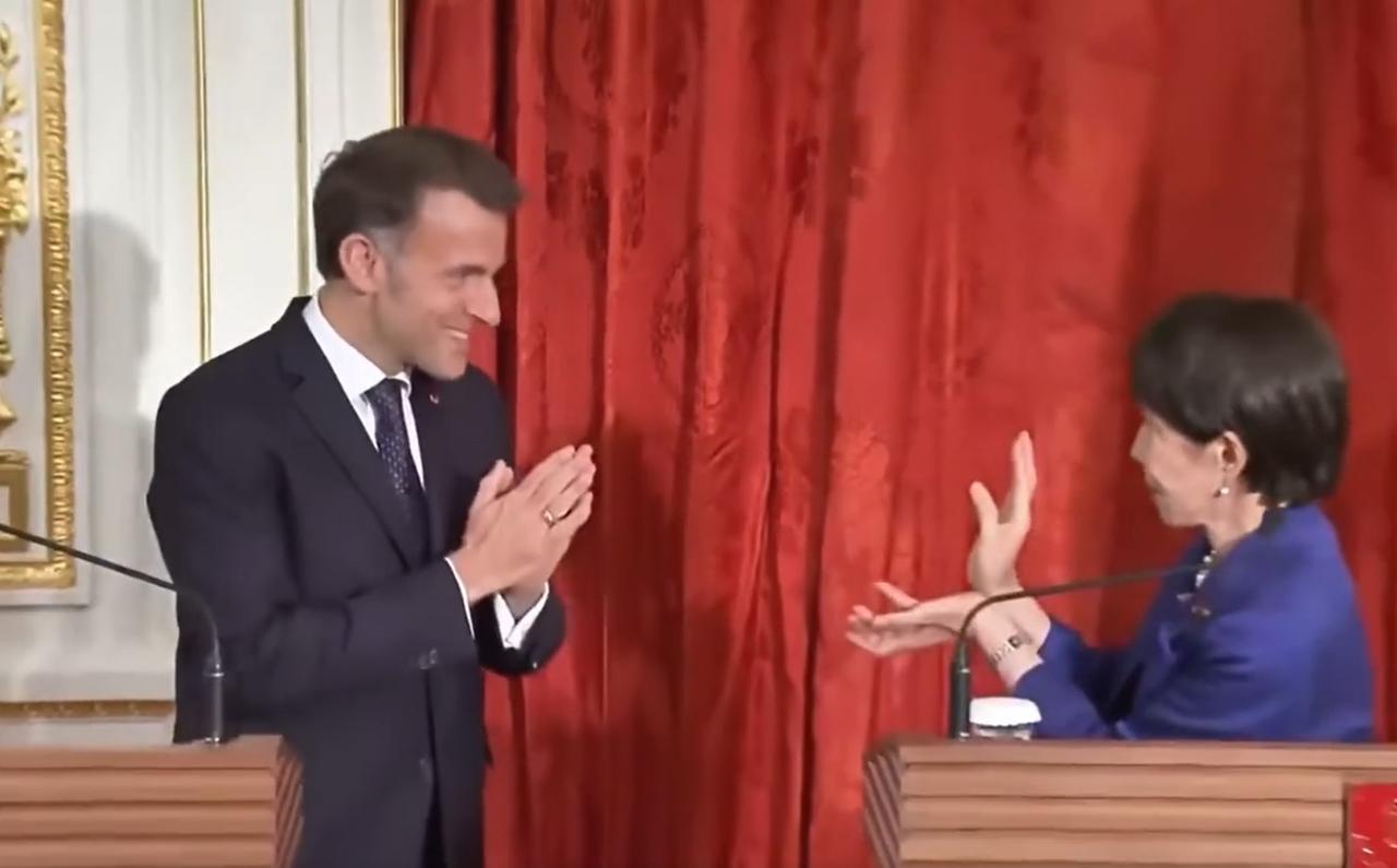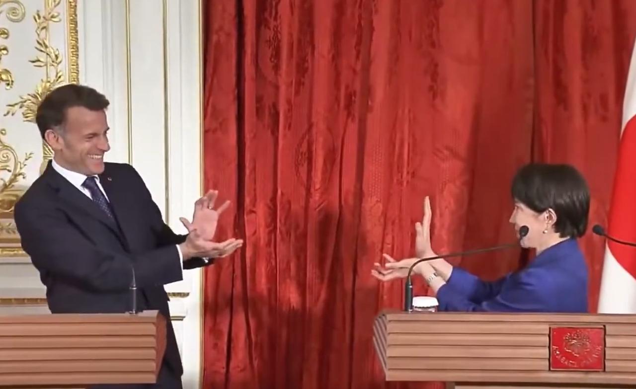 高市早苗把马克龙整不会了。 两人握完手之后,马克龙本来做了一个双手合十的敬礼,这在东亚的交往中普遍使用,但是没想到,高市却突然整了一个龟派气功。 这时,马克龙表现出了三个神情:惊讶、好笑、逗你玩。 于是也做出了同样的动作回敬高市。 要知道,龟派气功是进攻性的招数,不知道高市早苗对着马克龙做这个动作,是何用意?