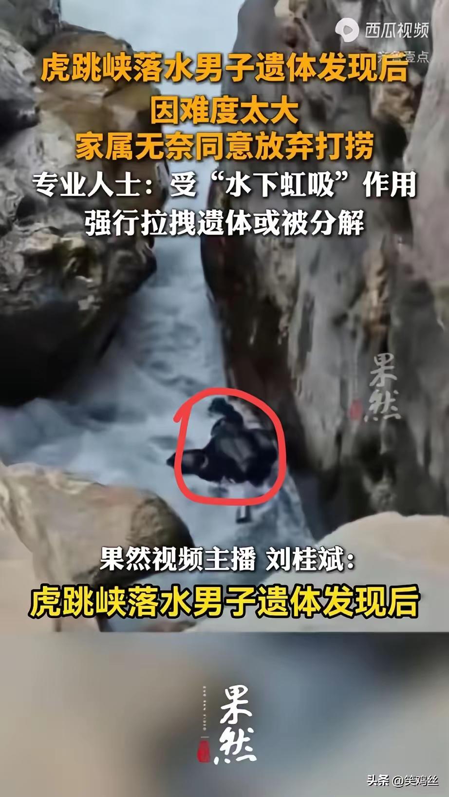 【为了洗一个杯子】 虎跳峡发疯石事故,一个29岁的美术老师与女友旅游最后一站就是虎跳峡。 返回后两人就结婚,举办婚礼,谁能想到他永远留在虎跳峡? 就为了洗一个杯子,他不顾警示牌,非要翻过去洗一个杯子。 所谓虹吸现象,太可怕,救援都无法把他的遗体拉出来。