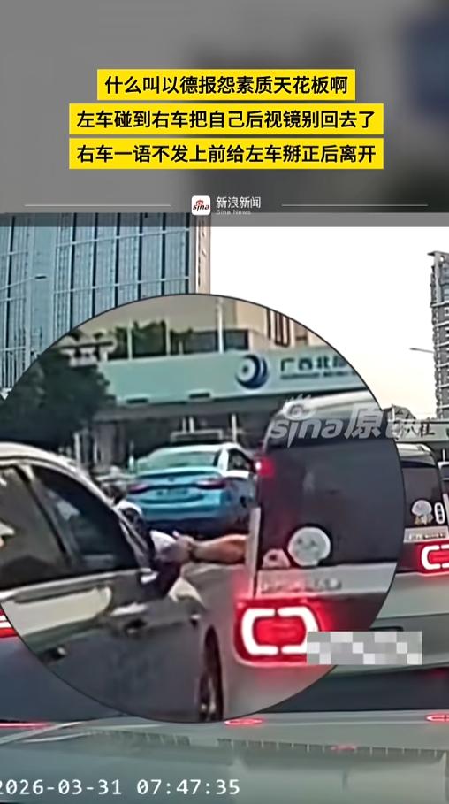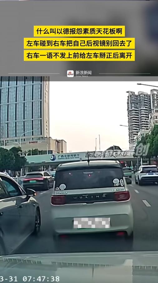 “素质天花板!”近日,广西南宁,拥挤的道路上,一车从左侧加塞超车,结果碰到了右车的后视镜,自己的后视镜被别回去了。没想到,通行后,右车往左一别,伸出手来把左车后视镜掰正,一句话没说,扬长而去!网友:哈哈哈哈哈哈! 开车在路上,遇到加塞的,车主肯定是十分气愤。要是再不凑巧,两车稍微碰下,哪怕就碰个后视镜,保不齐双方都得下来,大吵一顿,报个交警。 据媒体4月1日报道,事发当日,路上车很多,比较的拥挤。这时候,一辆车从左侧加塞,超车过去,没想到距离没弄好,轻轻碰了一下。左车的后视镜碰到了右车的后视镜,直接别回去了。 后面的司机看到这一幕,心想够呛能善了了。果然,几秒钟后,前方变灯,右车开始往前走,故意往左挤了些。后面车看到,估计这俩要整事了,搞不好又得堵一大堆。 可出人意料的是,右车车身稍微靠前了一下,司机就从窗户里伸出手,把左车的后视镜给掰了回去。然后一句话也没说,方向一打,直接就开走了。 网友看后表示,自己车被碰了,不仅没恼,还反过来去帮肇事车的忙,以德报怨也不过如此了吧!要是路上都是这种司机,哪还有什么路怒症?行车环境都得优化不少呢! 信息来源:《什么叫以德报怨素质天花板啊,左车碰到右车把自己后视镜别回去了,右车一语不发上前给左车掰正后离开》新浪新闻