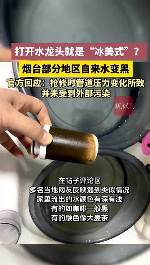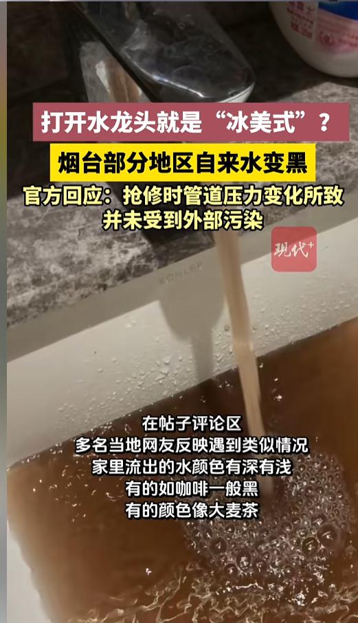 “免费的冰美式?”近日,山东烟台,有居民调侃,一大早醒来,打开水龙头就能喝到特调的“冰美式”,还有不少人附和,自家的是“酱油”、“大麦茶”。当地供水公司回复,供水管道抢修所致,水质没有问题。网友:天天出问题,天天说没问题! 自来水可是我们日常生活中的重中之重,洗衣做饭上厕所,可都离不了它,更是不少人的饮用用水。一旦出了问题,影响可太大了。 据媒体3月31日报道,事发当日,该居民打开自家水龙头一看,流出来的水颜色很深,根本不能用,放了一阵儿之后,水还是有些浑浊。该居民发视频挑战,住这儿真是好,打开水龙头就能喝到特调冰美式。 视频引起了当地不少人的共鸣。有的人说,自己家的是“特调酱油”,乌黑乌黑的,还有的说自己家的是“大麦茶”。很快,当地供水公司就做出了回应。 他们说,区域内有一根主供水管道损坏了,他们刚维修完。有一些泥沙等杂质混了进去,但是水质并没有问题,多放一会儿水就清澈了。 其实,这也不是第一次发生这样的问题了,去年就发生过两次,倒是也检测过,水质符合国家相关要求,但总这样,着实有些让人难以接受,质疑该公司的管理能力。 网友看后表示,别的问题我不关心,就是想知道,放出来这些浑浊的,不能使用的水,供水公司会给赔偿么?还是依旧按量收费? 信息来源:《山东烟台自来水管流出“冰美式”,官方回应》现代快报
