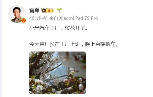 雷军秒变雷厂长!工厂上班没商量? 雷军最新发表动态:小米汽车工厂,樱花开了。今天雷厂长在工厂上班,晚上直播拆车。 看得出来,雷总心情很好,当然主要还是归功于小米业绩好,手机汽车大家电都卖得红火