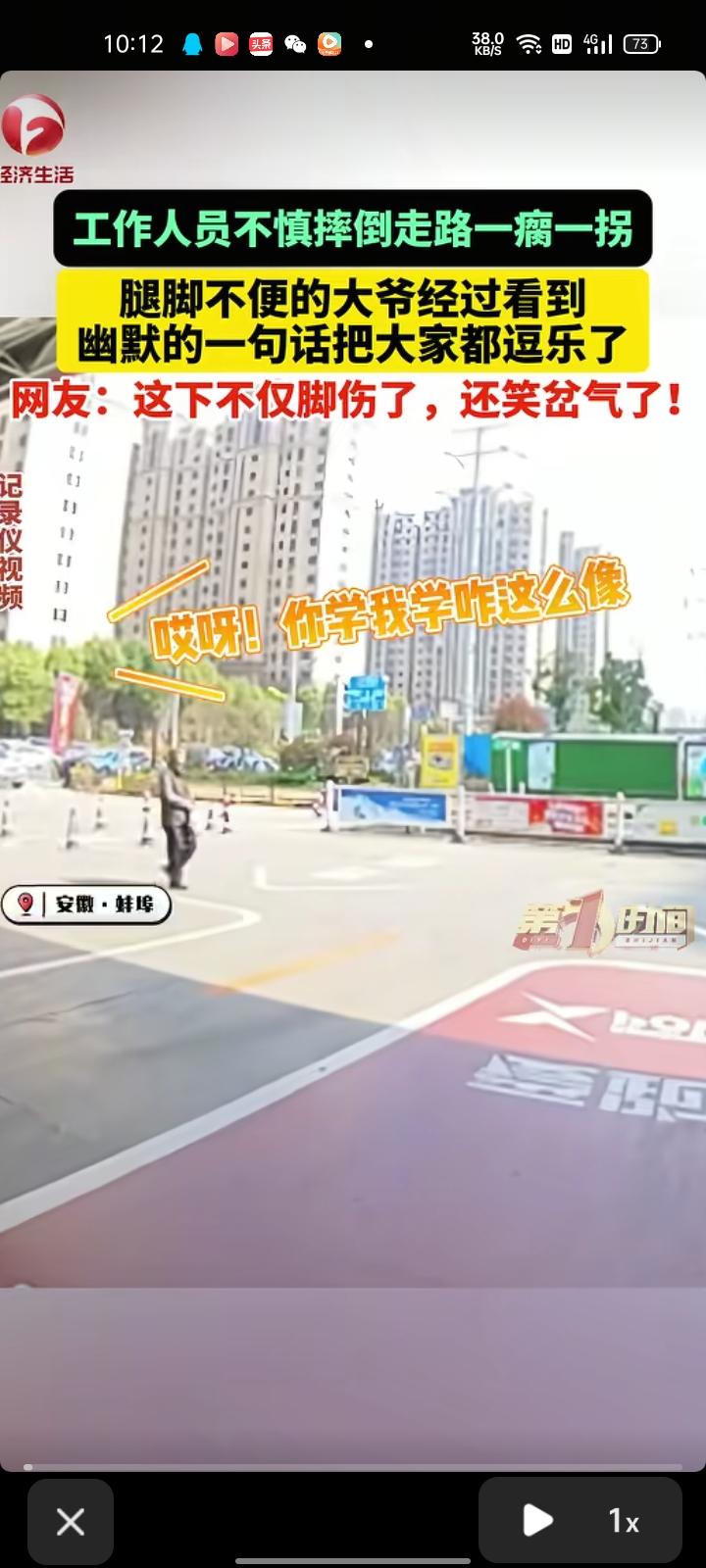 3月25日,安徽蚌埠。小伙去加油站加油,恰巧看到了一场即兴的小品表演。加油站工作人员不慎摔倒,走路一瘸一拐,正巧一位腿脚不便的大爷经过,看到后大爷以为工作人员是模仿自己的动作呢,这让大家给逗乐了。不得不说大哥真的挺幽默,让这位工作人员完全忘记摔倒后的尴尬和疼痛。