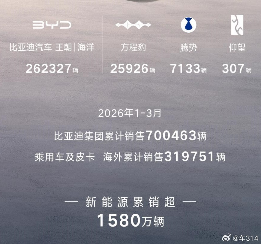 比亚迪3月份的成绩也官宣了,销售300222辆,重新拿回国内第一。其中,王朝与海洋262327辆,方程豹25926辆,腾势7133辆,仰望307辆,海外销量则达到了119591辆,都实现了出色的提升。有网友说,“8艘滚装船还是太保守了”,看来比亚迪未来还要建造更多的大船?对了,4月份闪充车型要开始大规模交付了,而且闪充站的建设也要加速铺开,大家可以期待一下!比亚迪3月份销售300222辆比亚迪新能源汽车