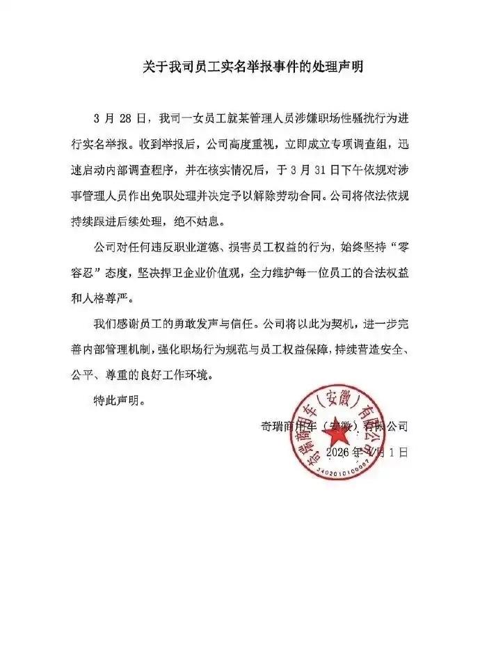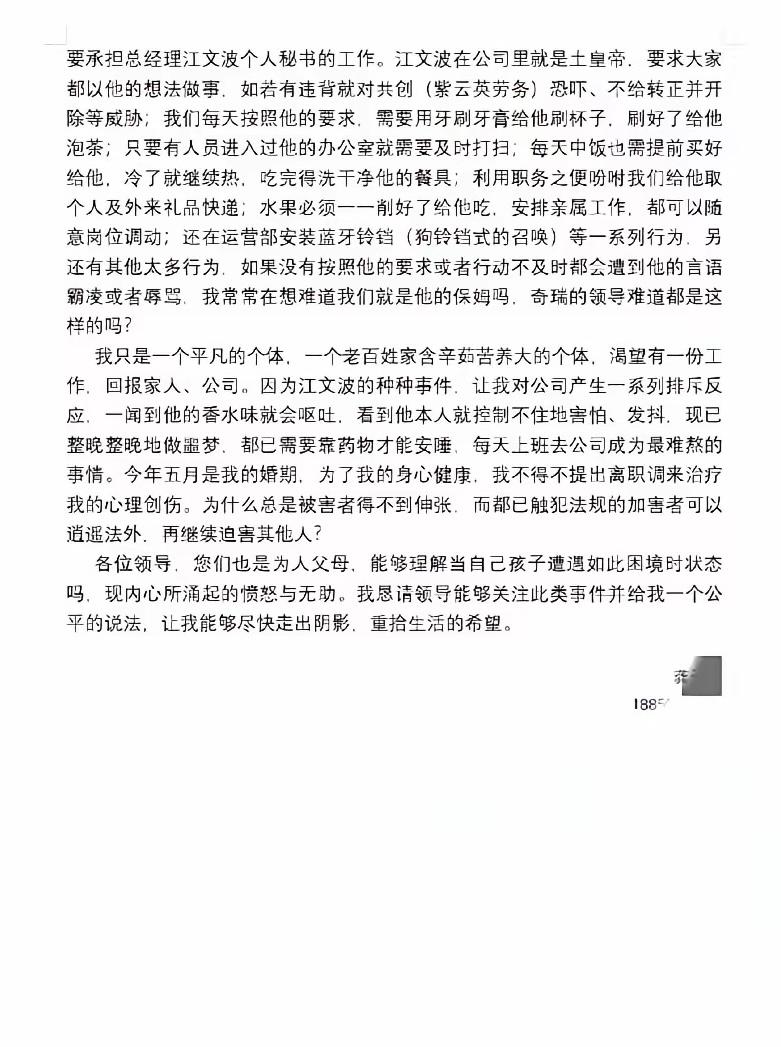 奇瑞00后女员工龚某实名举报领导江某对其性骚扰,并且同时骚扰部门多人,此前被爆料