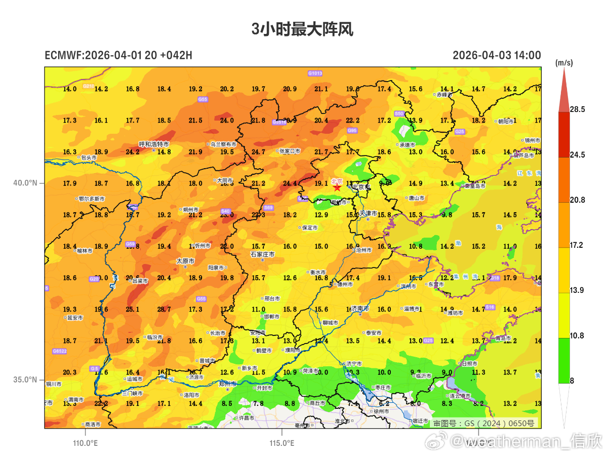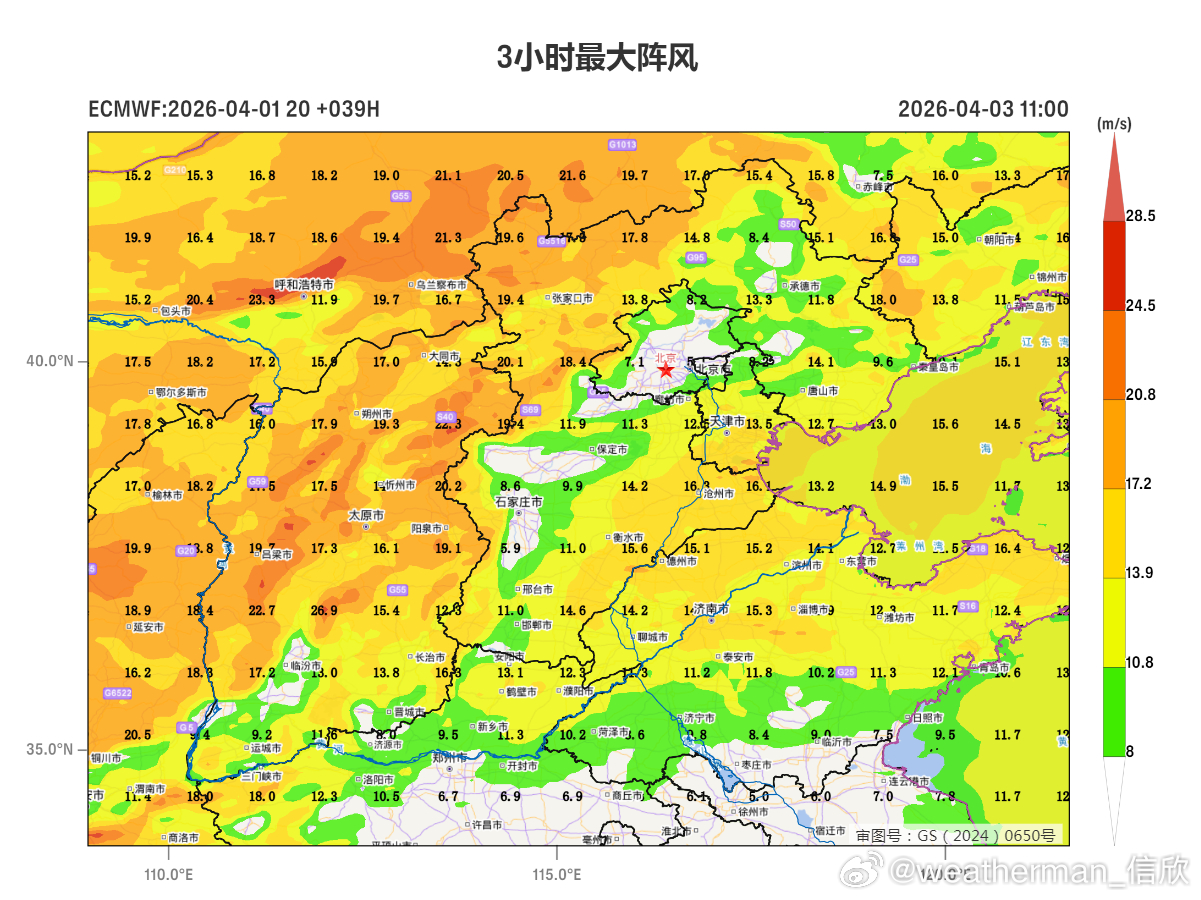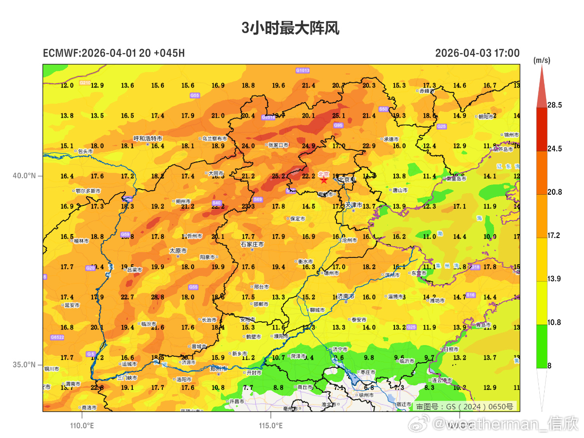 北京:4月3日早晨可能阴天,有些暖区的降雨。3日上午在冷空气到来前,天气可能还相对平静,3日午后起风,下午到晚上风最大,平原地区的阵风可能有7-8级,山区阵风更强。3日下午是否会有雷雨,待定。