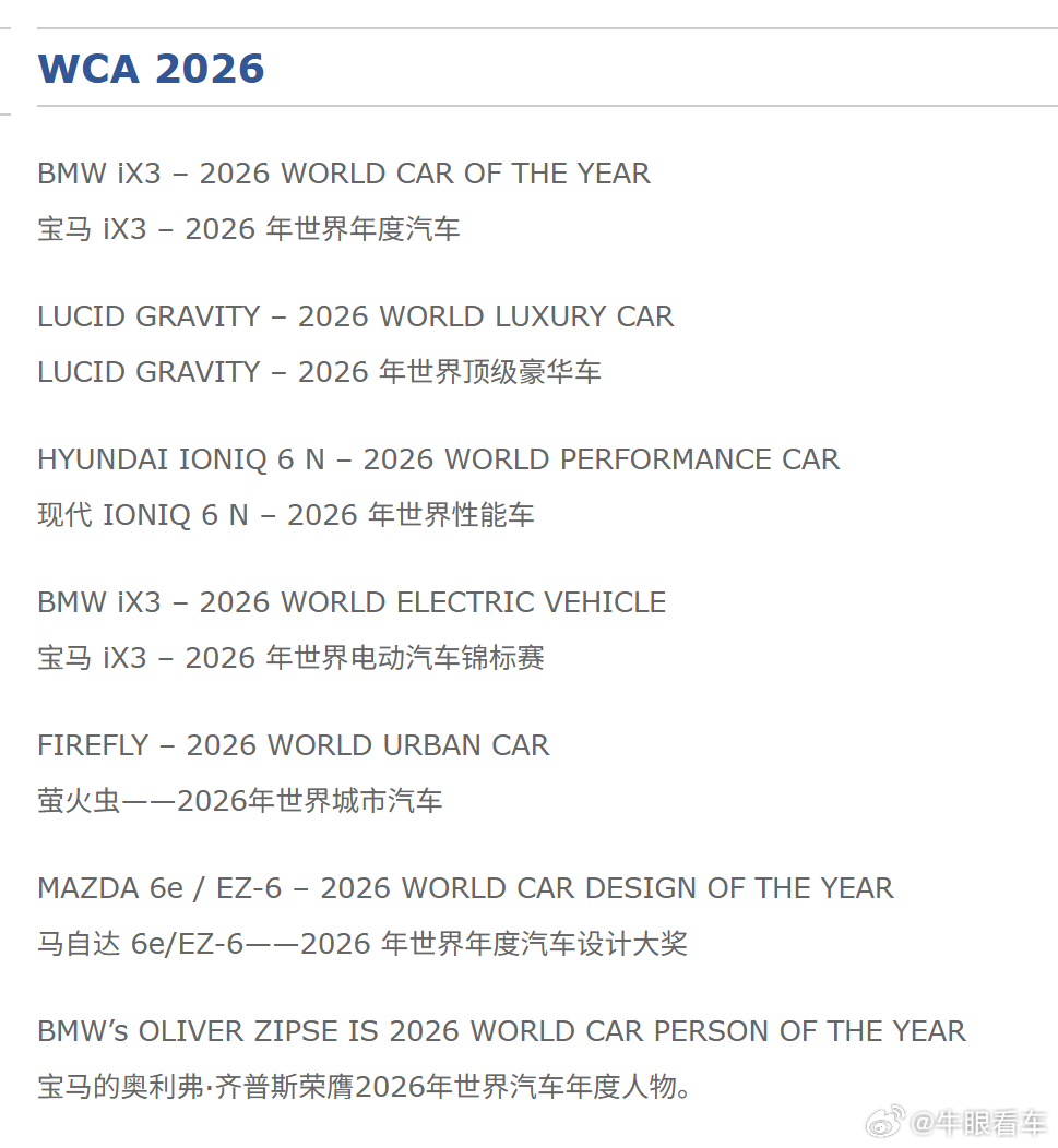祝贺萤火虫,祝贺齐普策world car awards 2026