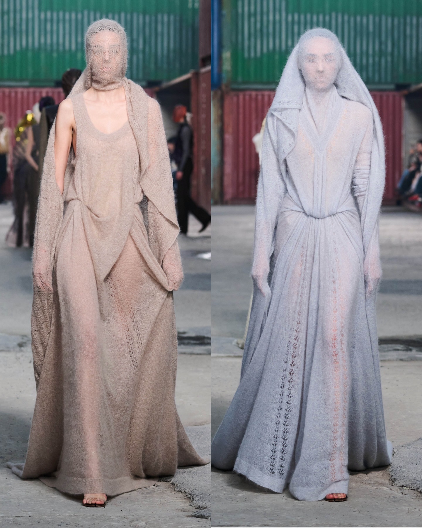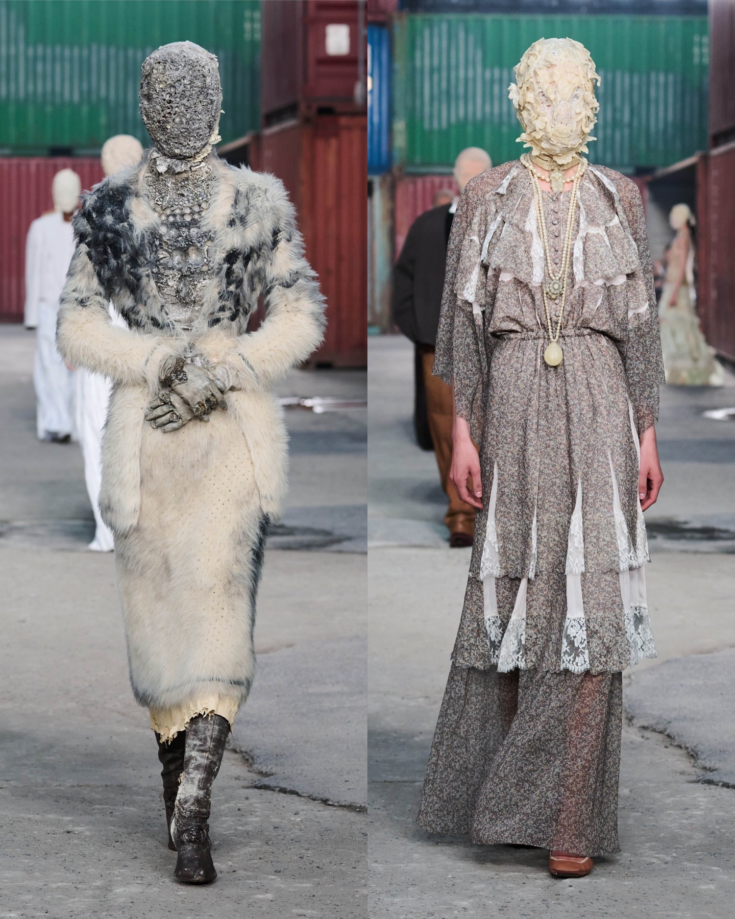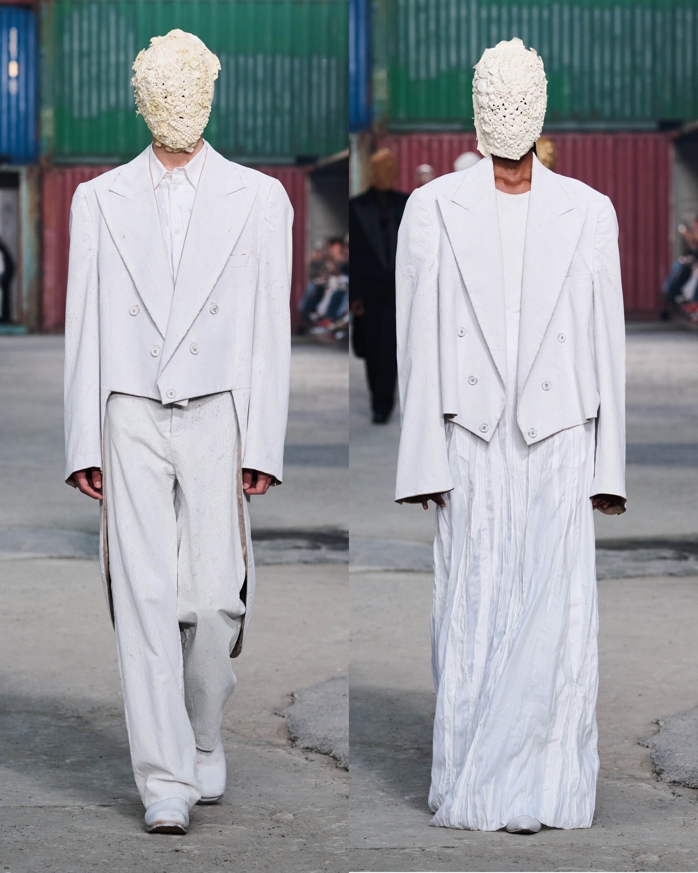 本季延续 Maison Margiela 的经典基因,以第二层肌肤般的贴身剪裁、Bianchetto 白漆工艺、异材质拼接以及面具式匿名美学等标志性语言,将旧物解构再造。