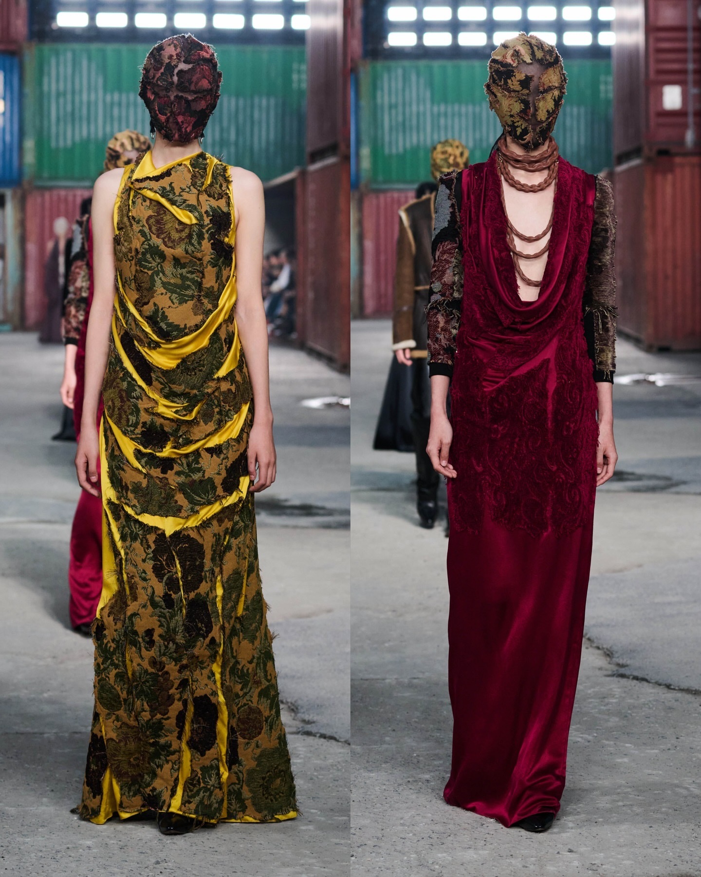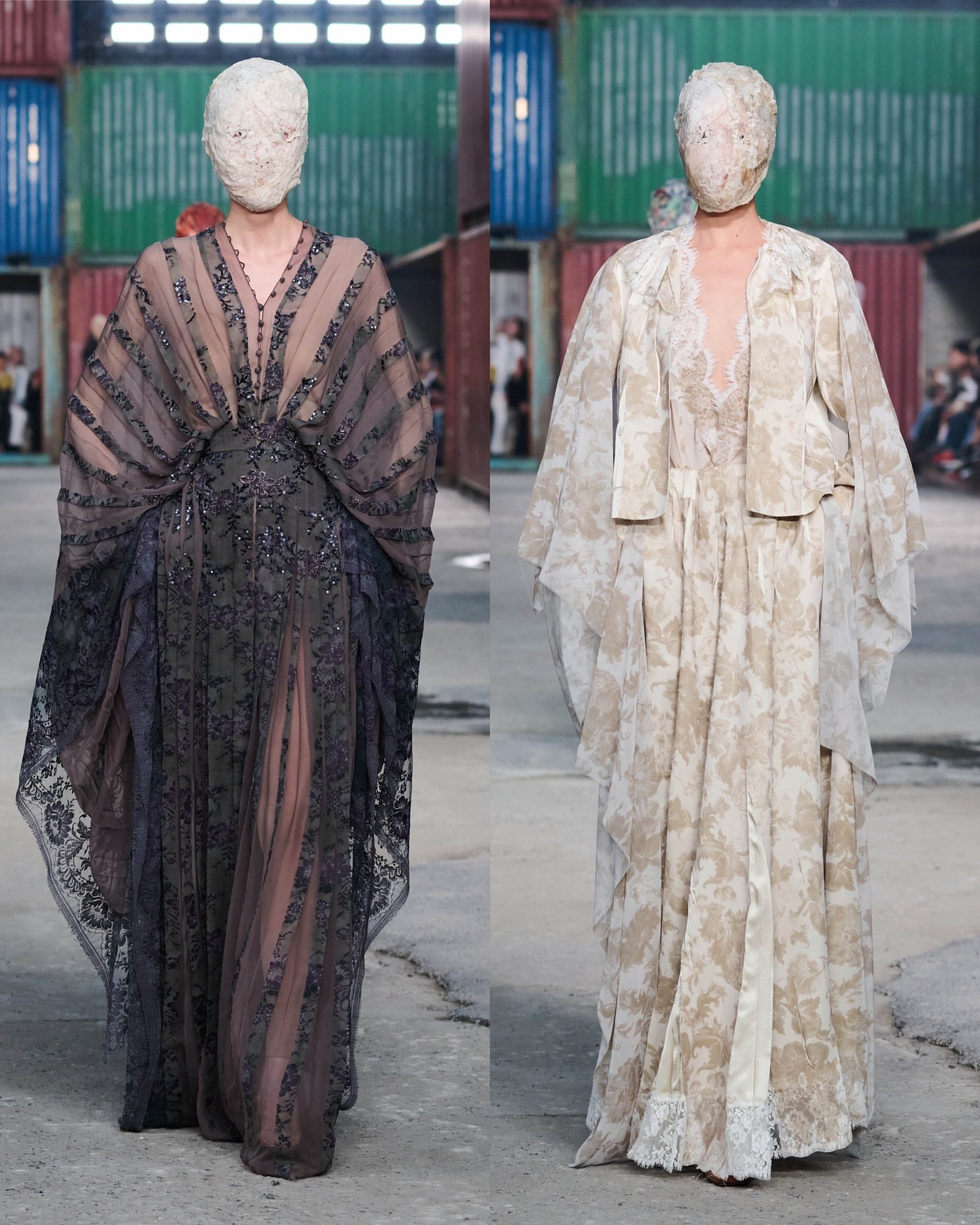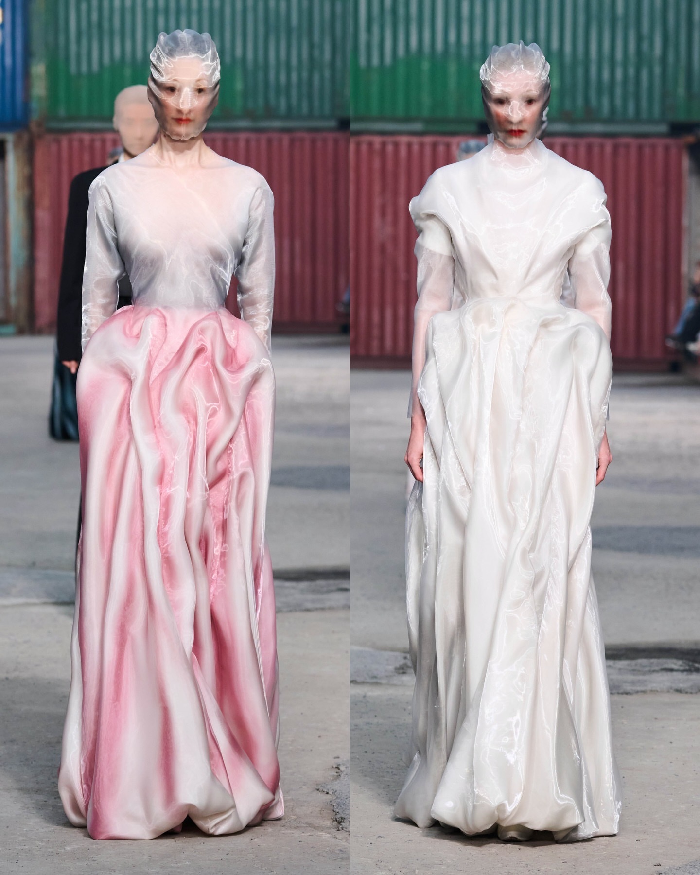 系列中亦融入大量东方元素,以中国的瓷器为核心灵感,透过多层欧根纱堆叠出如瓷质般细腻而脆弱的质感,并将手工烧制后再刻意破碎的瓷片,逐一镶嵌于高级订制礼服之上。蜂蜡,这一最早在中国用于制作蜡烛的材质,亦被复盖于部分手工连身裙上,赋予服装如时间封存般的肌理效果。