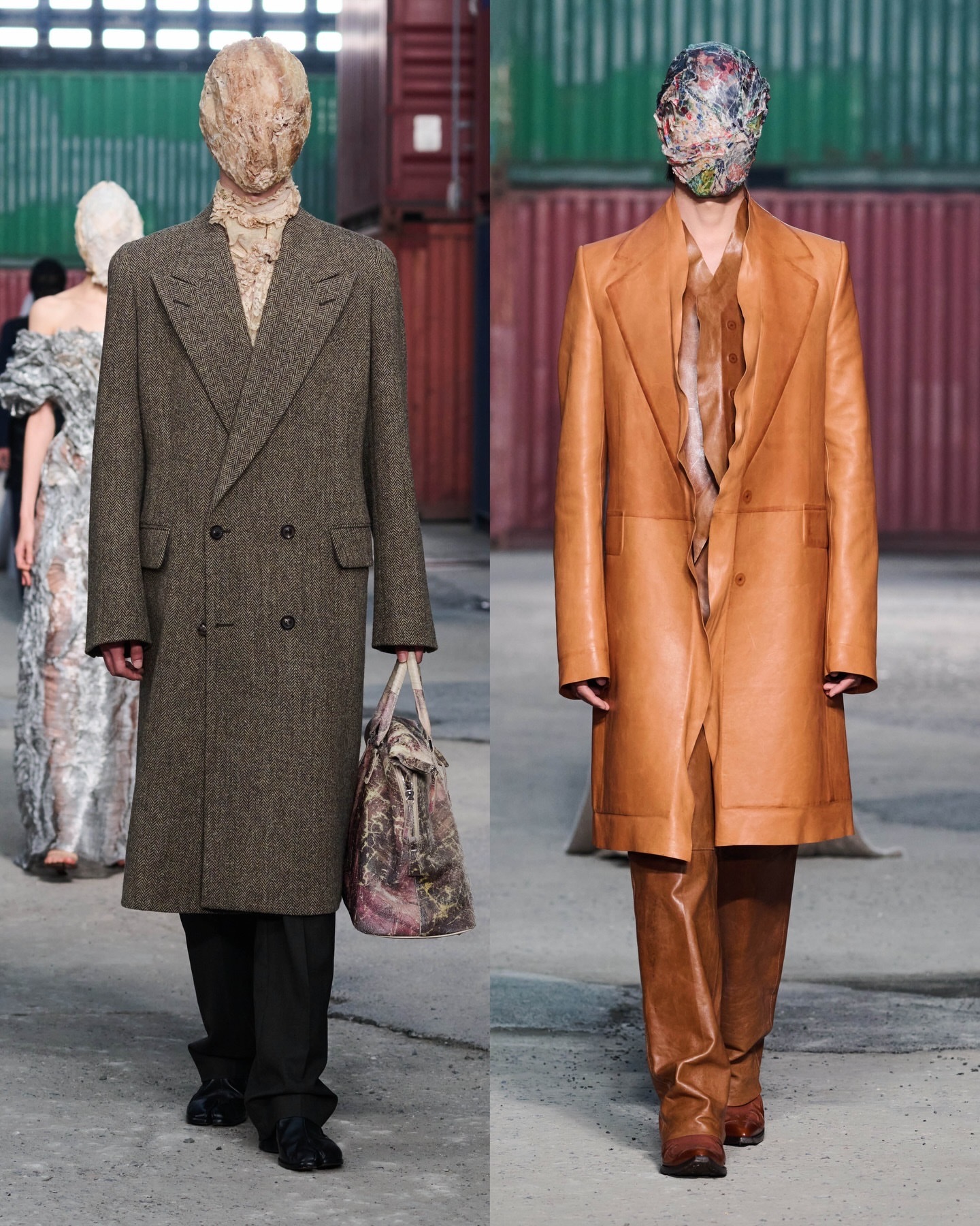 设计细节上,截短的燕尾服、西装与针织贴合的混构手法、皮革与花呢的融合,再到经亮片修补的破损 vintage 织物以及夸张公主袖等 Edwardian 时期的风格,皆被重新演绎,展现历史与当代、复古与前卫交叠的张力。本季不仅探索服装结构的边界,更进一步延续 Maison Margiela 一贯对身份认同、时间与物件记忆的深层思考。
