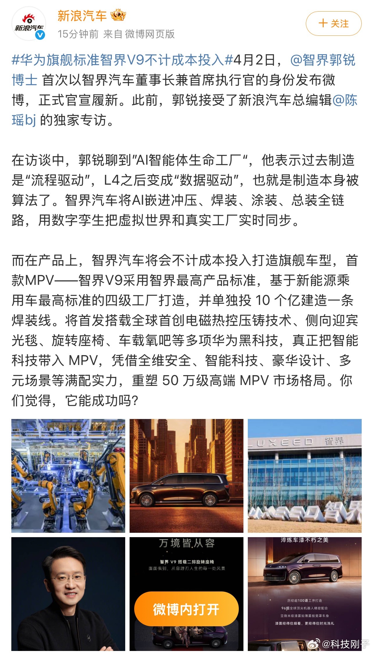 郭锐履新首秀,就亮出智界V9的王牌,斥10亿单独打造专属焊装线,将数字孪生、算法驱动贯穿冲压、焊装、涂装、总装全流程,用四级工厂的最高标准,为每一台V9筑牢品质根基。