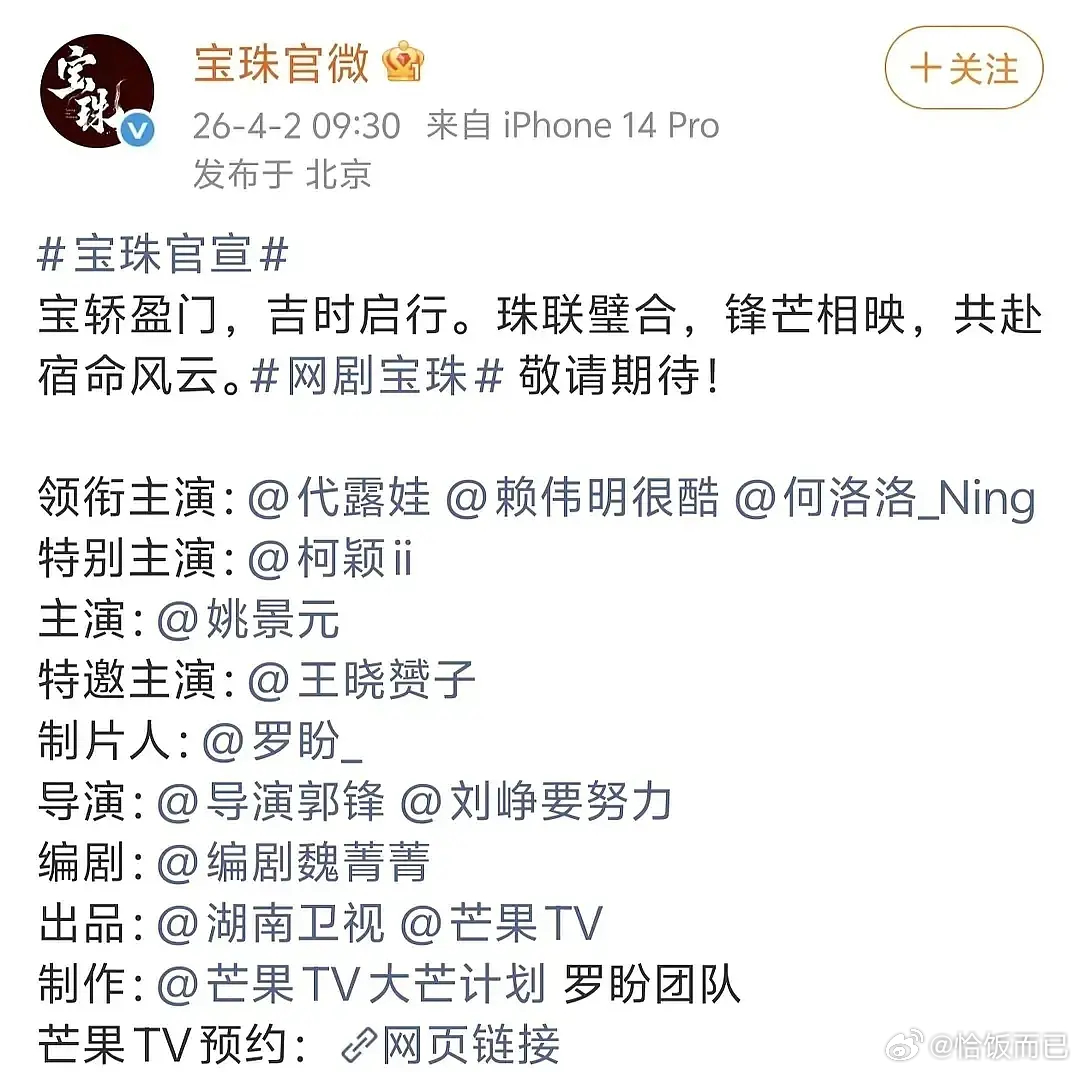 宝珠阵容官宣,女男主代露娃赖伟明,男二是何洛洛