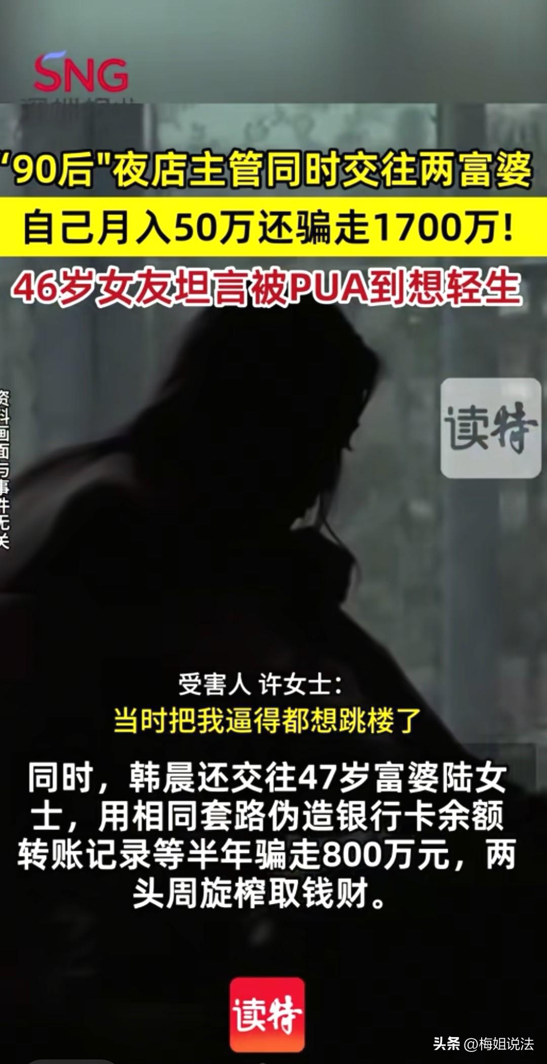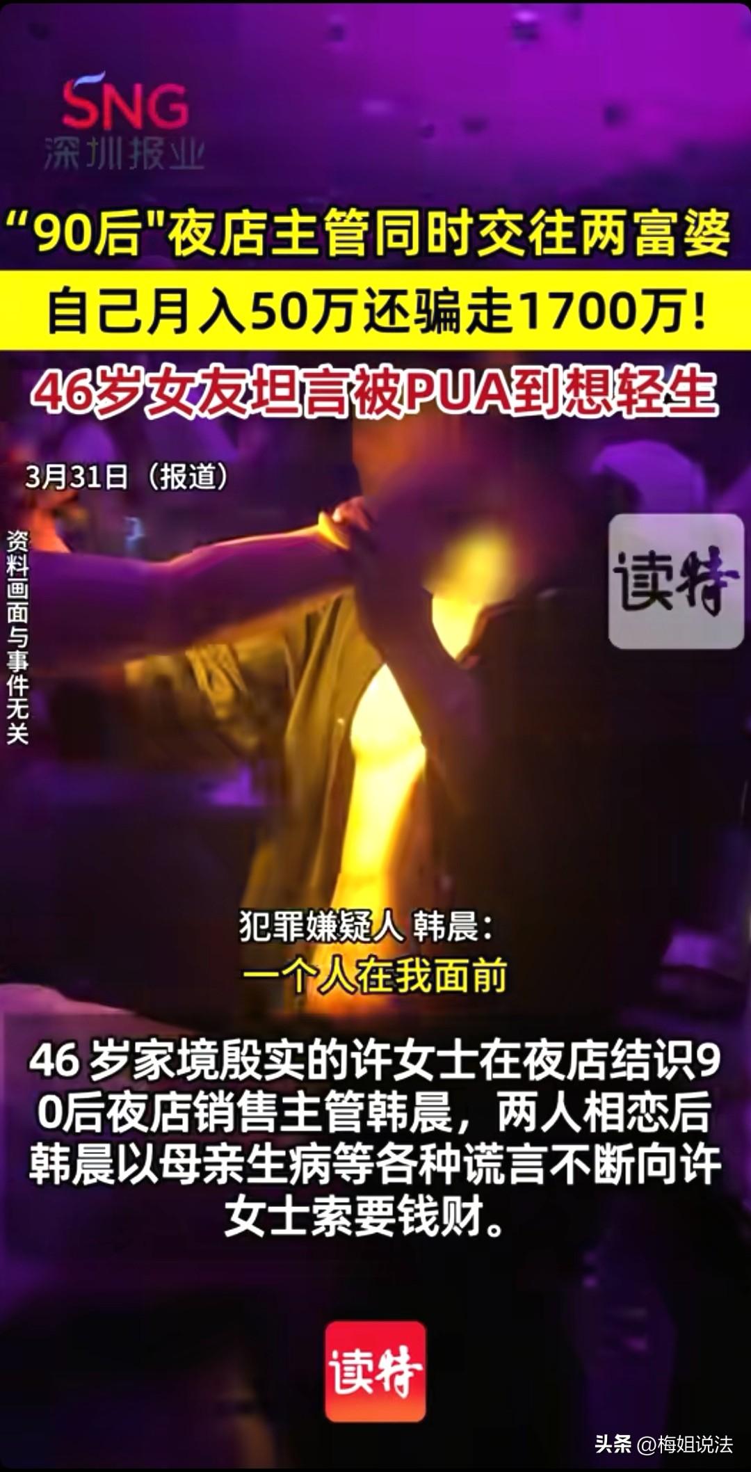 上海,90后韩某是某夜店的男模,他外形俊朗、能说会道,和46岁富婆许女士谈起了恋爱。随后韩某各种借口向许女士要了900多万。正当许女士还沉浸在爱情美梦里时,另一个“富婆”报警,逮走了韩某。原来,韩某与许女士恋爱的同时,还交往着47岁的陆女士,用同样手段骗取陆女士800多万。 许女士做建筑生意,这天和朋友在夜店玩,邀请了男模韩某到房间,几人玩的很开心,并相互加了联系方式。 韩某看到许女士衣着谈吐,判断她很有钱,用他的话说,有钱没钱一眼就看得出。 没几天韩某就对许女士展开热烈的追求,提供了让她难以拒绝的情绪价值,虽然许女士以年龄和身份差距较大拒绝了,但是韩某太懂她的情感需求了,终于让单身多年的她沦陷了。 两人最终建立恋爱关系。 通过相处,许女士观察到,韩某不但脾气好,会说话,会疼人,而且生活中特别节约。 虽然韩某月入几十万,但是穿的衣服很普通,吃的更是随意,出行连打车都不舍得。 凡此种种更让许女士满意,但是看着男友这么寒酸,心里很心疼,就主动给韩某买高档服装,两人消费更是从不让他买单。 一个月后,韩某故意在她面前,显露心事重重的表情,许女士主动询问才知,韩某母亲脑梗住院,急需用钱。 救命钱哪能不给,许女士主动借给了他一笔钱。 没多久,韩某按时归还,许女士对他的信任更增加了。 好久不长,有天韩某突然发来一个截图,说自己因为一笔钱,使得自己的账户冻结了,需要“退赃解封”。 许女士信以为真,转了数十万元,这笔钱自然打了水漂。 转完钱没几天,韩某告诉她,自己取保候审,必须交钱。 许女士自然不想男友坐牢,再说如果男友进去,借的钱也还不了了,就这样又转了几十万。 以后韩某每要必给,共转了900多万。 如果韩某不被抓,许女士仍填着无底洞。 韩某被抓,了解案情后,她才知道,还有另一个47岁陆女士被骗,陆女士常年生活在新加坡,而且与韩某交往的时间更久。 韩某同样以相同理由借钱,为了更真实,他甚至伪造了余额400多万的截图。 那么陆女士怎么发现并报警的呢? 她人在外地,担心韩某另寻他欢,经常打视频电话查岗,每次两人都会为此争吵。 最后一次吵架后,陆女士回忆了韩某每次要钱的借口,心里也产生了怀疑。 于是委托律师去查询,一查才知道,韩某银行卡从没有被冻结过,更没有受过任何刑事处罚。 一切都是韩某编造的谎言,陆女士愤而报警。 如梦初醒的许女士此时知道被骗后,她嘴里还一口一个老公,深信韩某是爱过她的,而且主动签署了谅解书。 其实许女士是有机会减少损失的,她的钱用完了,就向朋友借钱转给韩某。她朋友知道用途后,多次规劝她,小心被骗,她像着了魔一样根本听不进去。 那么韩某骗了1700多万,自己每月还有30多万收入,这些钱到底去哪了? 原来韩某在大学时就沉迷网络赌博,导致大学没毕业就混迹夜场,凭借毒辣的眼光,卑劣的手段,骗了巨额钱款。 只不过现在巨款全部还了赌债,赃款难以追回。 目前,韩某以诈骗罪被判处有期徒刑12年。 《刑法》第二百六十六条:诈骗公私财物,数额特别巨大或者有其他特别严重情节的,处十年以上有期徒刑或者无期徒刑,并处罚金或者没收财产。 韩某诈骗1700多万,属于数额特别巨大,判处12年是罪有应得。 在可怜两位女士的同时,是否也该反思下她俩是如何一步步进入陷阱的? 爱情是美好的,但建立在金钱基础之上的爱情,本身就不可靠,更何况遇到了别有用心之人。 据《治安管理处罚法》第八十二条:以营利为目的,为赌博提供条件的,或者参与赌博赌资较大的,处五日以下拘留或者一千元以下罚款;情节严重的,处十日以上十五日以下拘留,并处一千元以上五千元以下罚款。 如果是开设赌场,以赌为业,更违反了刑法,处罚更严厉。 韩某因赌上瘾,进而诈骗,毁了自己的学业,也毁了自己的人生。 信息来源:深圳新闻网