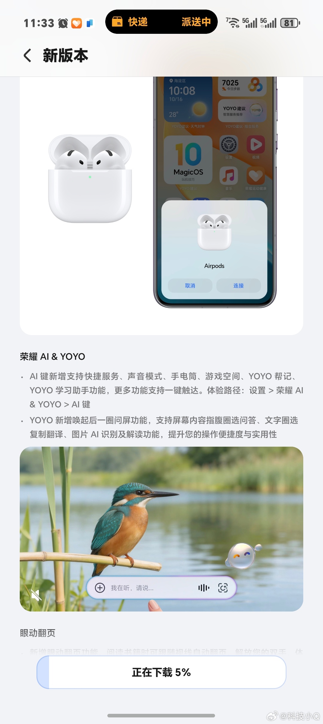 荣耀Magic V6这一版更新真的大 11个G支持AirPods啦系统动画 AI也有提升