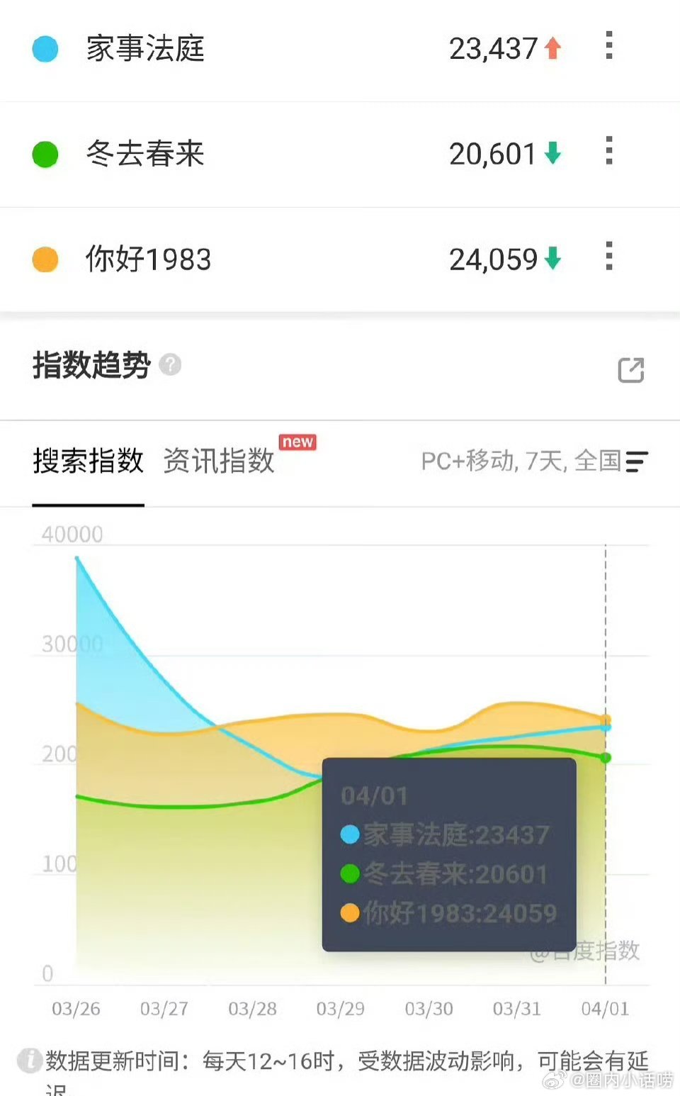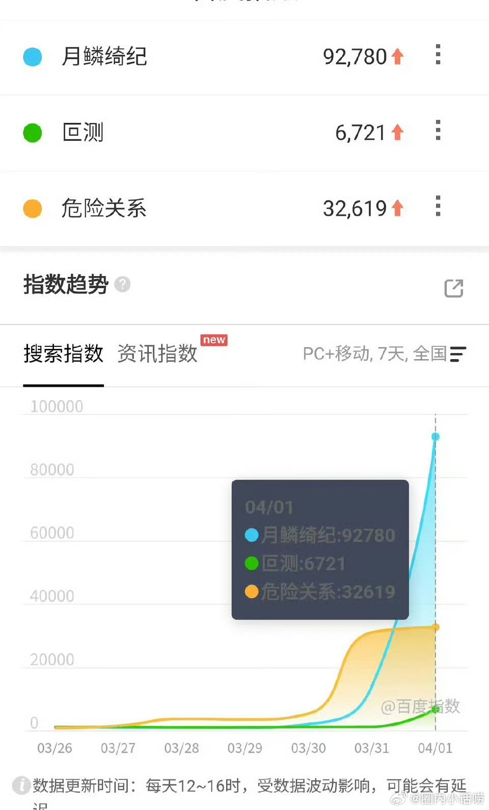 昨天各个在播剧的百指。从数据看,月鳞绮纪碾压白日提灯啊。