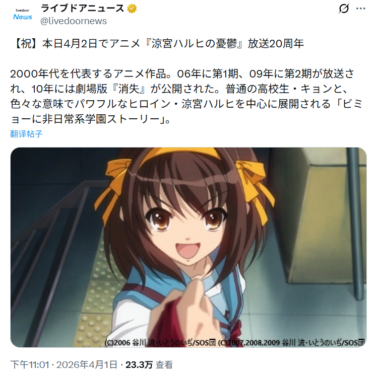 20年前的今天(2006年4月2日),动画《凉宫春日的忧郁》正式播出!凉宫春日的