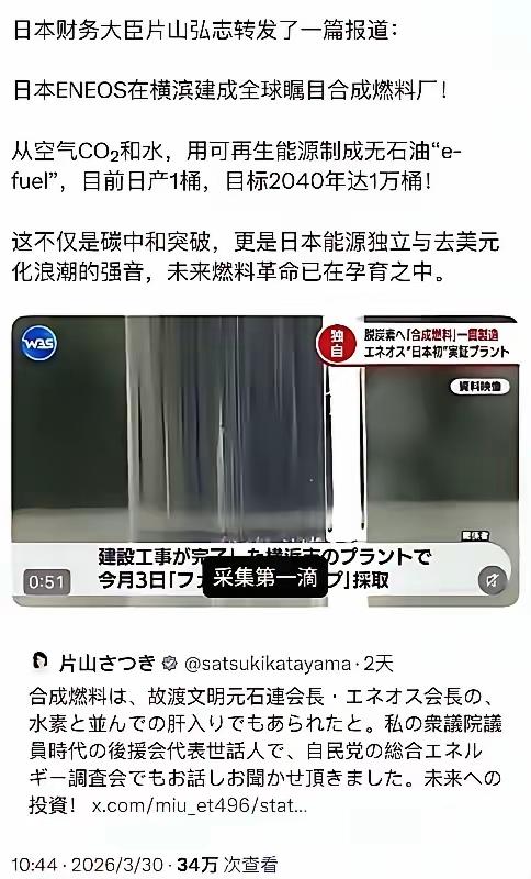 日本议员在转发,有些中国网友也跟着在转发。 说日本发明用水和二氧化碳生产石油! 目前的产量是日产一桶,目标到2040年产一万桶。 不了解情况的会误以为这科技高大上。 懂行的知道这只不过是緑氨! 绿氨,前提是需要大量的电力,电解水得到氢气,氢气和空气中的氮气可以合成绿氨,作为燃料,中国已经出口韩国六万吨。 而日本目前一天才能生产一桶,这差距真的很大。 中国有风能,太阳能,潮汐发电,第四代核电站,生产的緑氨已经可以商业化,成本低。 二日本没有这些新能源,二桶石油才能生产一桶緑氨,纯粹就是噱头。