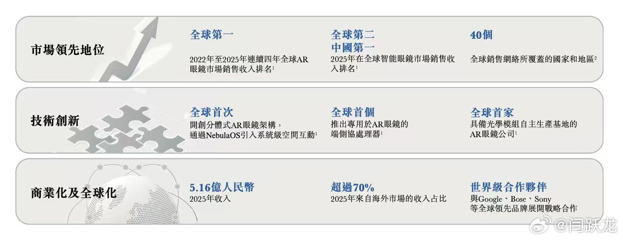 根据艾瑞咨询(iResearch)数据显示,按销售收入计,XREAL在2022年至2025年连续四年稳居全球AR眼镜市场第一;在更广义的智能眼镜市场中,XREAL于2025年位列全球第二、中国第一。