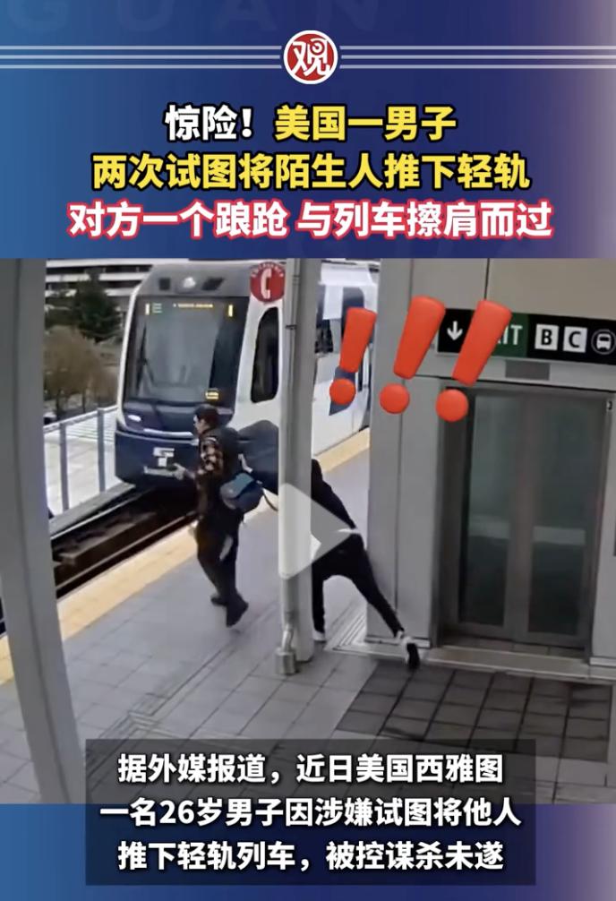 “真是天生恶魔!”近日,美国西雅图,一位身穿方格衫的男子正在站台等轻轨,不远处轻轨正在慢慢驶来,这时一个黑衣人躲在柱子后面慢慢靠近等车男子。 而等车男子还在聚精会神的看着手机视频,丝毫没有注意到危险的来临,就在轻轨即将到达等车男子身前的一刻,黑衣人突然窜出来,伸出双手猛的把等车男子推向轻轨。 男子被推的向前踉跄了好几步,差一点就撞上了轻轨车辆,好在及时刹住了脚步,而黑衣人见男子没撞到轻轨车辆,又跑向前继续猛推男子,此时车辆就在男子身边擦身而过。 可能是因为等车男子的身体比较高大,黑衣人推了两次后没有得逞,然后就转身快速逃离了,等车男子追了几步也没有追上。 看了视频后感觉黑衣人太坏了,真是天生恶魔,无缘无故的就把人推向轻轨,这分明就是故意杀人,如果不是被推人身体比较强壮的话,那说不定就被轻轨撞着了,那样就危险了。 一位网友说,二十多年前看过一台湾教授的讲课视频,他提醒在美国等地铁的时候,要尽量背靠墙,防止别人把你推下去。 现在看来,那位教授说的是真的,在美国真有这样的人,这件事也给大家提了个醒,出门在外时一定要注意安全,尤其是在等车时,尽量让身体背对着墙壁,防止被这种坏人所害。