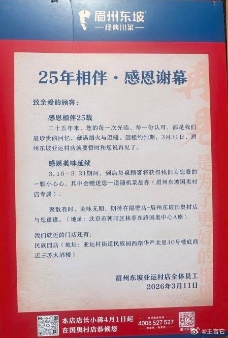 ‼️ 眉州东坡酒楼(亚运村店,位于朝阳区慧忠北里111号)于 2026年3月31日正式闭店。