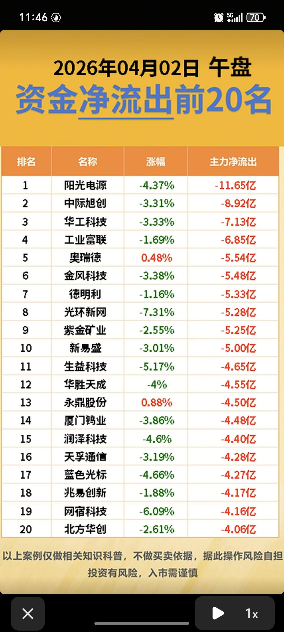 【4月1日主力资金净流出前16名榜单】当日主力资金净流出规模居前的16只个股