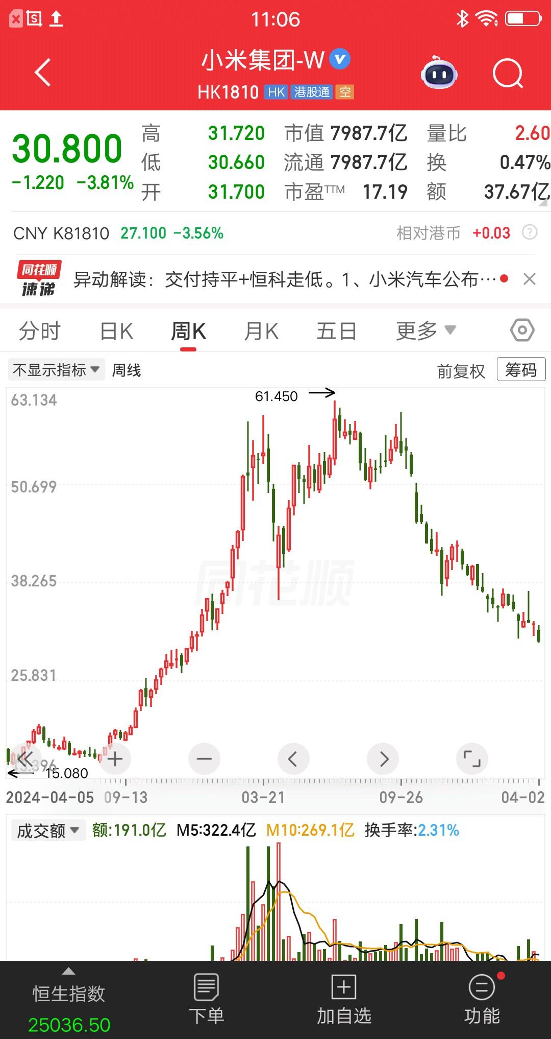 一位重庆的股民,今天割了小米集团的股票,亏了大概17万块。他看到一条快讯,“小米集团跌超4%较2025年6月27日高点61.45元股价已腰斩”,心态彻底绷不住了,一气之下清仓了。 他是在去年7月18号,以57元的价格买了36万多,刚建完仓信心满满,开始幻想要赚大钱了。买完以后股价小幅调整了两周,也就跌了十几个点,但是他一点都不慌。后面又反弹回来,涨到59块多,账户小幅盈利,但是这点利润他根本看不上。可是他不知道的是,这将是小米回不去的巅峰。 后面股价一路下跌,回过头来看他才明白自己被套了。每天要死不活的走势,搞得他心情死气沉沉的。 他晒图说“割了感觉一身轻松呀”,有人回复他说“俺也一样”。 希望这位重庆的股友,重新开心起来,快乐每一天吧。
