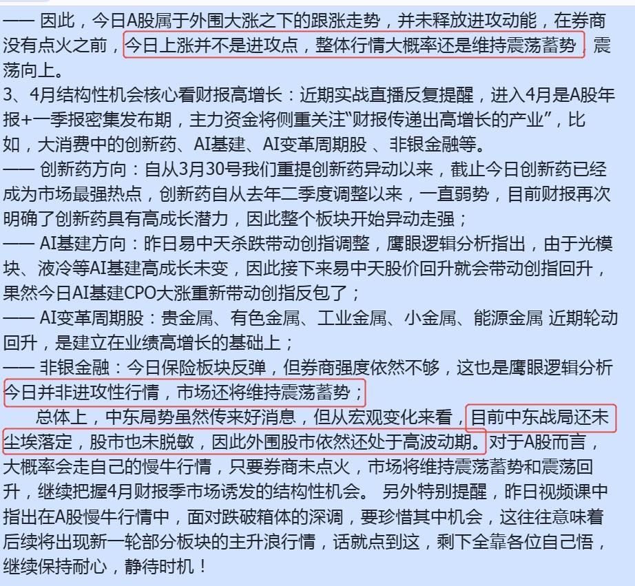 面对股市的反复折腾,鹰眼逻辑除了告诉大家保持耐心之外,继续提醒4月财报期核心关注点就是业绩高增长逻辑和利空出尽成利好的策略,什么意思呢? 一方面是年报+一季报维持高增长的板块将会在本轮市场调整后迎来新一波进攻性机会;另一方面像大消费等业绩不好的板块在财报利空出尽后,会迎来修复性机会,若届时有扩大内需等政策引导则会出现强势补涨机会。