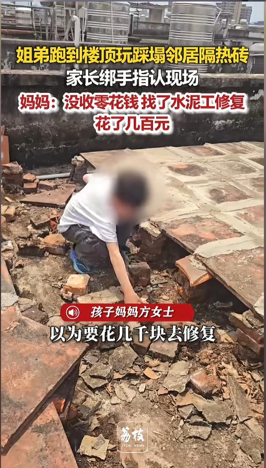 “这下后悔了吧”近日,广东揭阳,姐弟俩在跑楼顶上玩耍,看见邻居家的隔热砖,就在上面蹦蹦跳跳,结果给人家踩塌了。妈妈知道后,绑着两个孩子的手,让他们去指认现场,还把两人的零花钱都给没收了!网友:没打一顿算好的了! 谁小时候还没调皮过,没捅过篓子,都是年少不懂事,打两顿就好了。现在也有家长,开发出了新的教育方法。 据媒体4月1日报道,事发当日,方女士的两个孩子跑到了楼顶玩耍,搁自己家还没够,又跑到了邻居家屋顶,结果就闯了祸。邻居家为了降温,在楼顶上砌了隔热砖,被姐弟俩踩塌了一大片。 方女士知道后,十分气愤,拿绳子把俩孩子的手给捆了,学着警察办案的样子,让两个孩子带着指认了现场。之后,又把两个孩子的零花钱给没收了,用来修复邻居的屋顶。 之后,方女士请了水泥工来修补,两个孩子也没让闲着,过去给打下手,弥补自己犯下的错误。刚开始,方女士还以为自己得花大几千呢,结果几百块就搞定了。尽管如此,为了让孩子长记性,没收的零花钱并没有还给孩子。 网友看后表示,这教育方法挺好的,让孩子知道犯了错就得承担责任,弄坏了东西得给人修复,得赔钱,弄不好还得被抓起来。早点让孩子了解这些,其实是一件好事! 信息来源:《姐弟跑到楼顶玩踩塌邻居隔热桩 家长绑手指认现场 妈妈:没收零花钱 找了水泥工修复 花了几百元》荔枝新闻