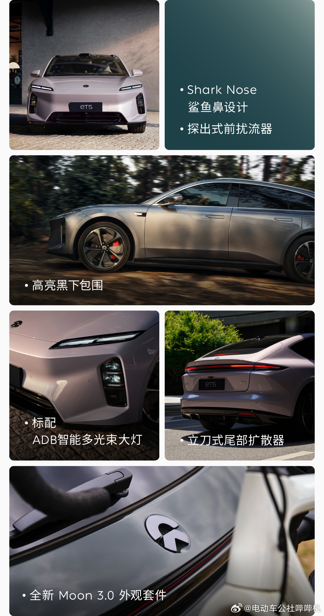 新款蔚来ET5、ET5T,外观升级全新套件,并升级配置:标配方向盘加热、前排坐垫延长并增加通风按摩、后排座椅加热、智能香氛系统等,标配小蓝灯,内饰升级双拼色。