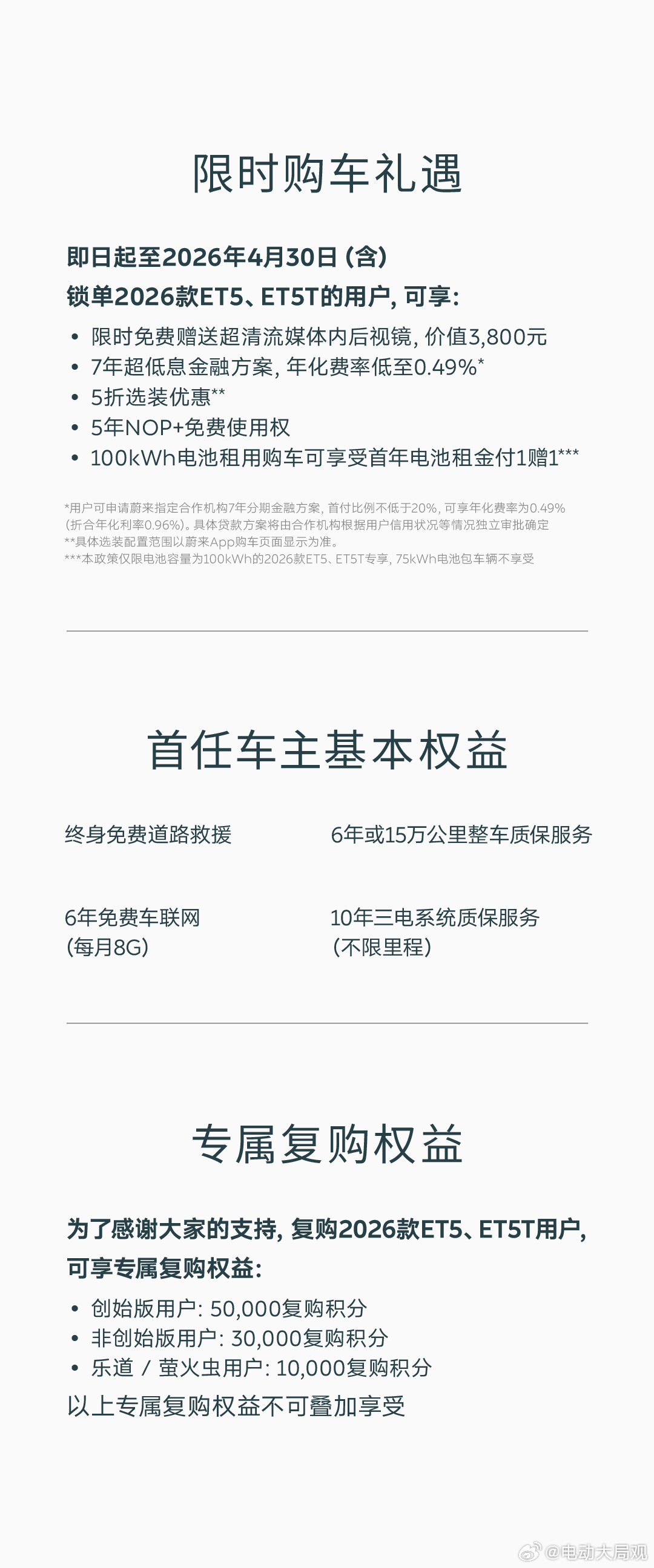 2026款ET5/ET5T正式上市加量不加价还有限时优惠100度电池租金一年内买一送一价值3800的流媒体后视镜免费送还有7年低息等限时购车礼遇蔚来汽车蔚来et5蔚来et5t