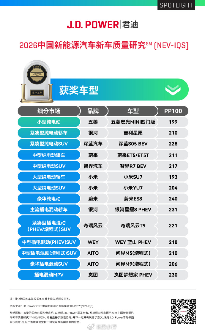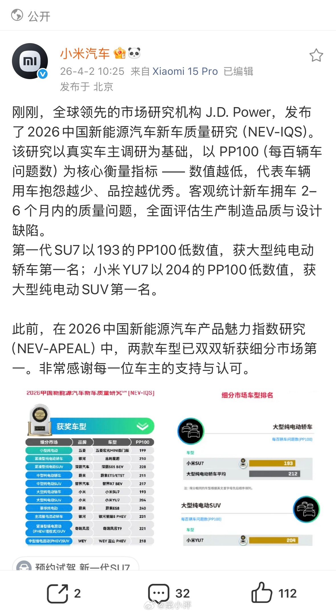 J.D.Power都知道吧?刚发布的2026中国新能源汽车新车质量研究榜单,小米SU7和YU7拿下各自细分市场冠军,以真实车主作为调研基础,得到数值越低,抱怨越少,品控越优秀!