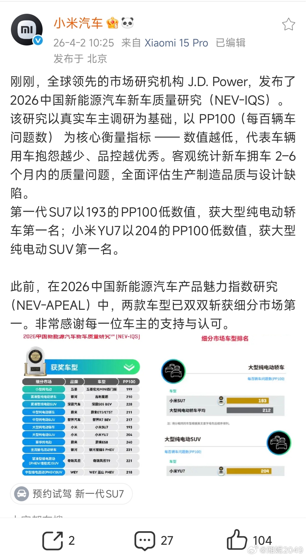 SU7和YU7能同时拿两个第一,说明你米算是彻底把“可靠”这件事玩明白了。