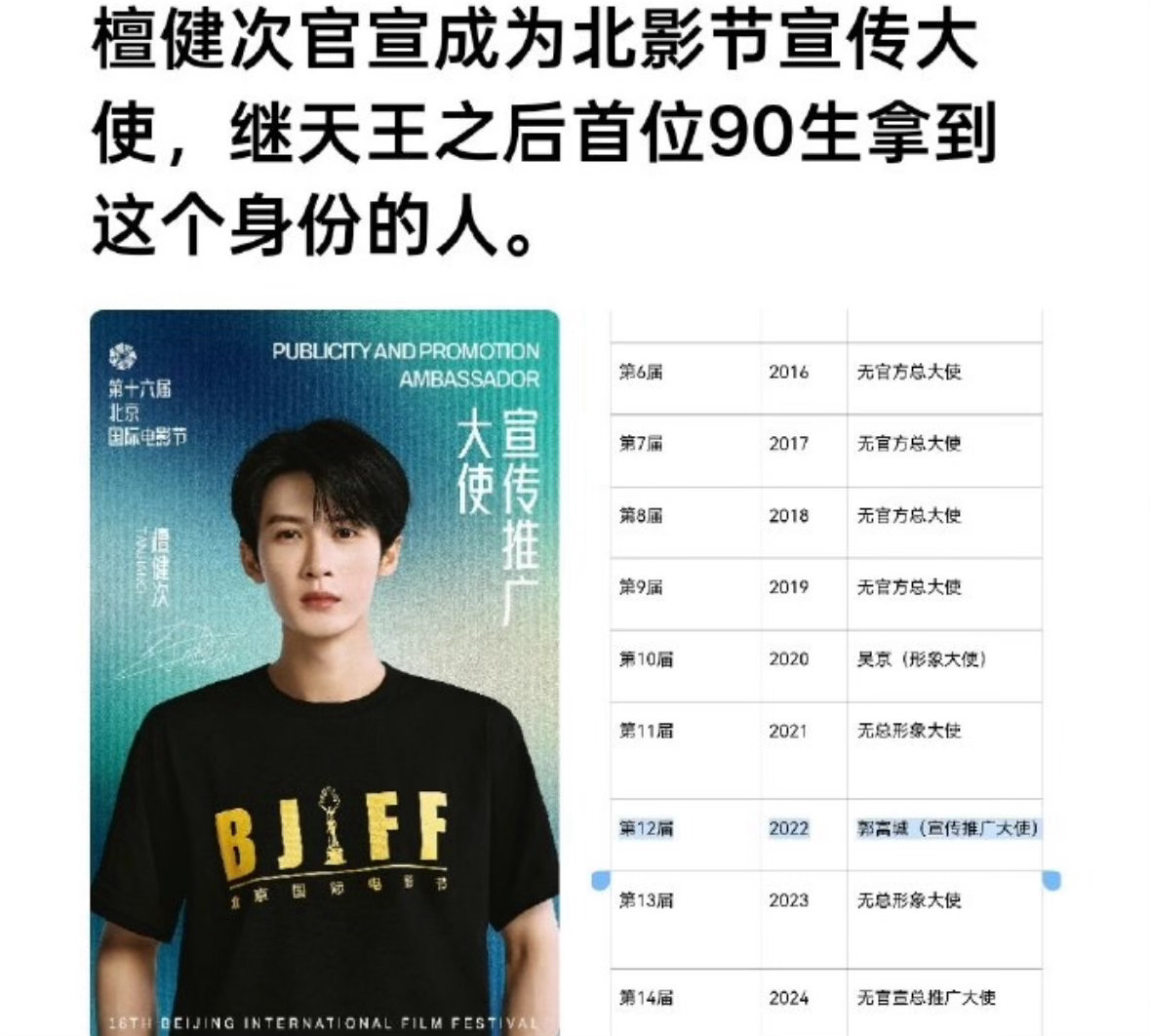 檀健次成为首位拿到北影节宣传大使的90生❗这个檀儿太争气了,命里带🔥