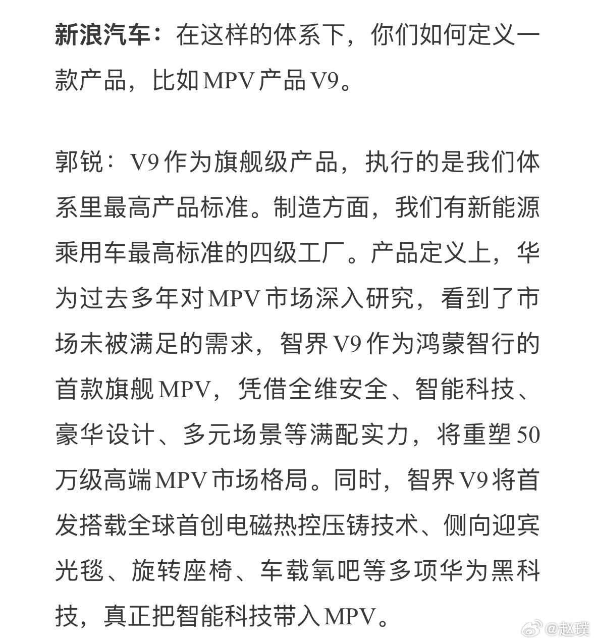 他提到将采用智界最高产品标准、不计成本投入打造智界V9,甚至单独投了10个亿建造一条焊装线。