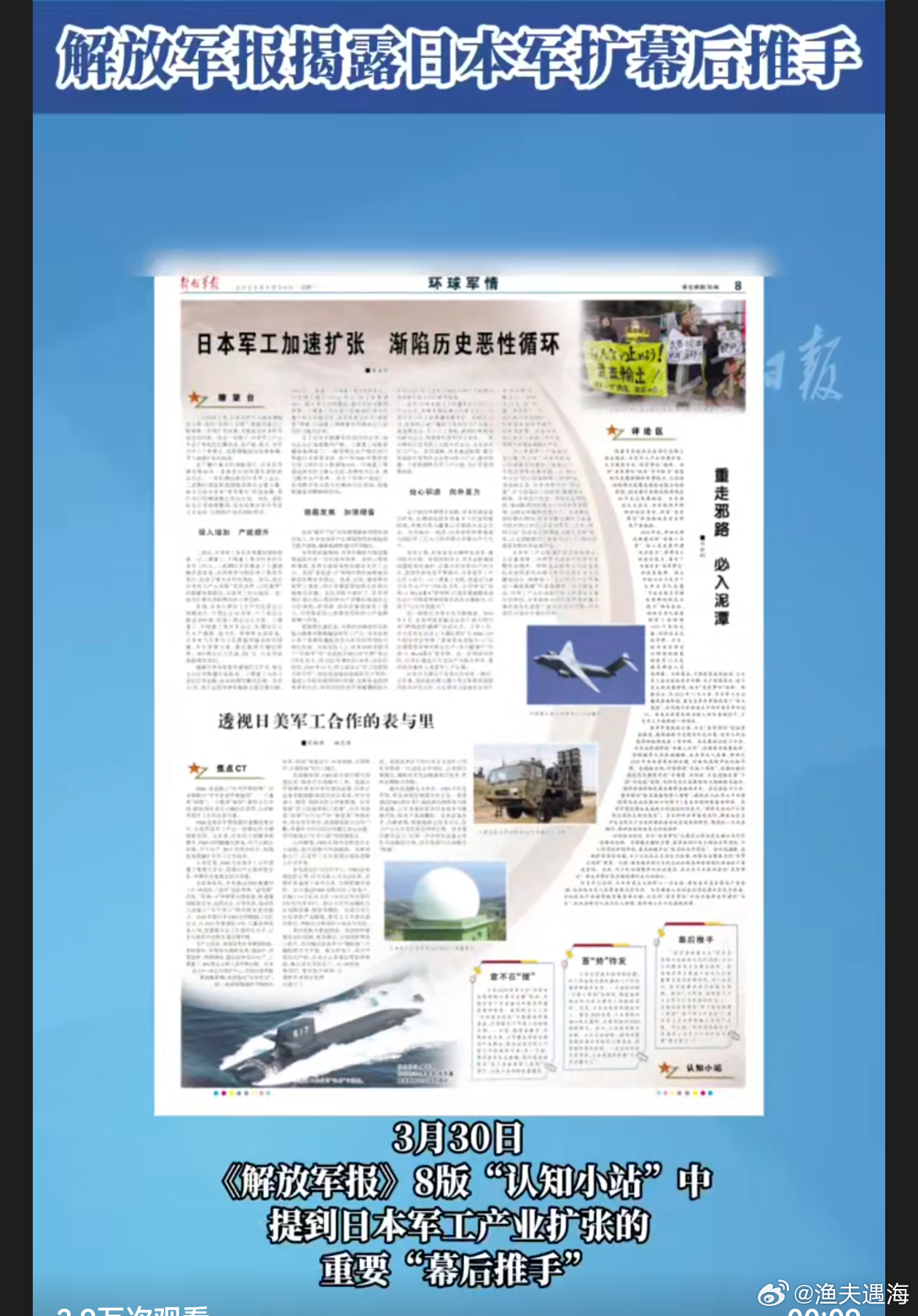 解放军报揭露日本军扩幕后推手日本“经济团体联合会”为一己私利,推动军工产业扩张,煽动政府修改政策、放开出口。其行径严重违背和平发展理念,反映出日本部分势力妄图突破战后限制、重走军事扩张老路,给地区和平稳定带来极大隐患,必须高度警惕。