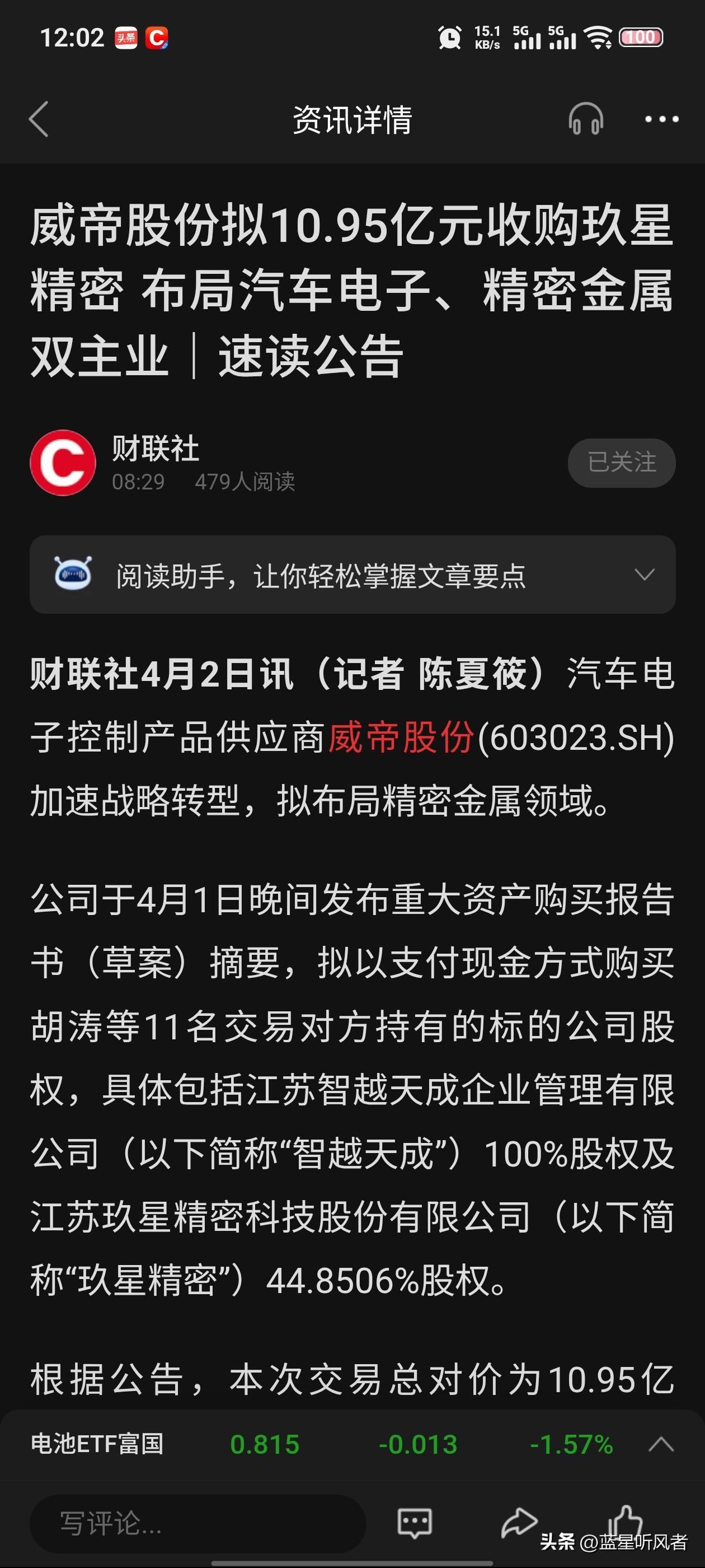 11亿重组落地却跌停?威帝股份这波操作藏着3个大坑 刚看到威帝股份(603023)10.95亿重组落地的公告,结果今天直接临近跌停!截至午盘跌幅超9%,市值蒸发近3亿,这波过山车谁顶得住? 先划重点:公司昨晚公告花11亿收购玖星精密90.97%股权,搞“汽车电子+精密金属零部件”双主业,还承诺2026-2028年净利润累计不低于3.6亿,交易对方还要拿28%对价买股票锁定3年,看着全是利好啊! 为啥利好反杀?核心踩了3个雷: 1. 估值太贵,性价比拉胯:玖星精密100%股权对应估值约24亿,溢价率超400%,而威帝自身总市值才30亿左右,11亿收购占了小半壁江山。高溢价并购本来就容易引发市场质疑,毕竟商誉雷是悬在头顶的利剑。 2. 转型太急,兑现周期长:公司原有汽车电子业务增长乏力,想靠并购快速换赛道,但精密金属零部件业务的盈利释放至少要等3年承诺期完成。短期看不到业绩增量,资金自然没耐心炒作。 3. 资金借利好出货:前期重组预期已经炒了一波,现在正式落地刚好成了“利好兑现”的信号。主力资金趁机高位跑路,今天开盘5分钟就砸出超2%跌幅,换手率飙升,散户接盘情绪直接被浇灭。 最后提醒下,这种重组并购股本来就波动大,加上威帝市盈率TTM超1200倍,严重透支预期,没上车的别冲动,持仓的注意控制风险,别被深套!