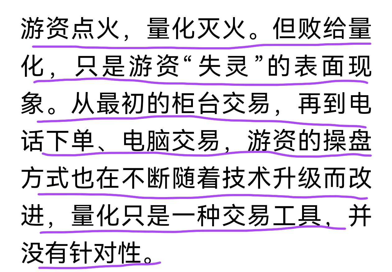北京商报这观点有点意思,游资“失灵”是资本市场的进化;量化只是一种交易工具,并没有针对性。游资“失灵”确实算是好事,但是量化交易也不非这么“单纯”。 游资本身也算不上“技术流”,就是利用T+0(限制了卖盘)、涨停板规则,凭借资金实力拉抬股价,吸引跟风盘,高位套现获利而已,其整体资金不大,妖股是有限的,散户只要克服贪婪,完全可以选择避开这些标的。游资“失灵”有监管趋严的原因,更有量化机构的对手交易,让游资的拉抬力不从心。 量化交易的“算法流”只是其优势之一,还在于其整体资金实力,先进的交易装备和便捷的交易通道,廉价的交易费用,这些是游资无法匹敌的,游资“投降”是必然的结果。不过游资“失灵”是市场净化言之尚在,确实如商报所言,量化没有针对性,现在量化规模扩张,交易量占到市场的30%多,中小盘股几乎都是其标的,波动大、换手高的就是好股,长线资金和散户没法识别量化交易,也不可能避开量化,遇到的问题不比游资小。量化只是一种交易工具,但这种工具与普通交易相比有绝对优势,节制不够就会造成市场伤害。 这几天追剧《生命树》,当时藏羚羊濒危,并非源自狼群等天敌,而是人性的贪婪+枪支。枪支只是工具,但对藏羚羊、狼群具有绝对优势,只有严控枪支,严管盗猎者,藏羚羊才得以生存,生态才能保持平衡。