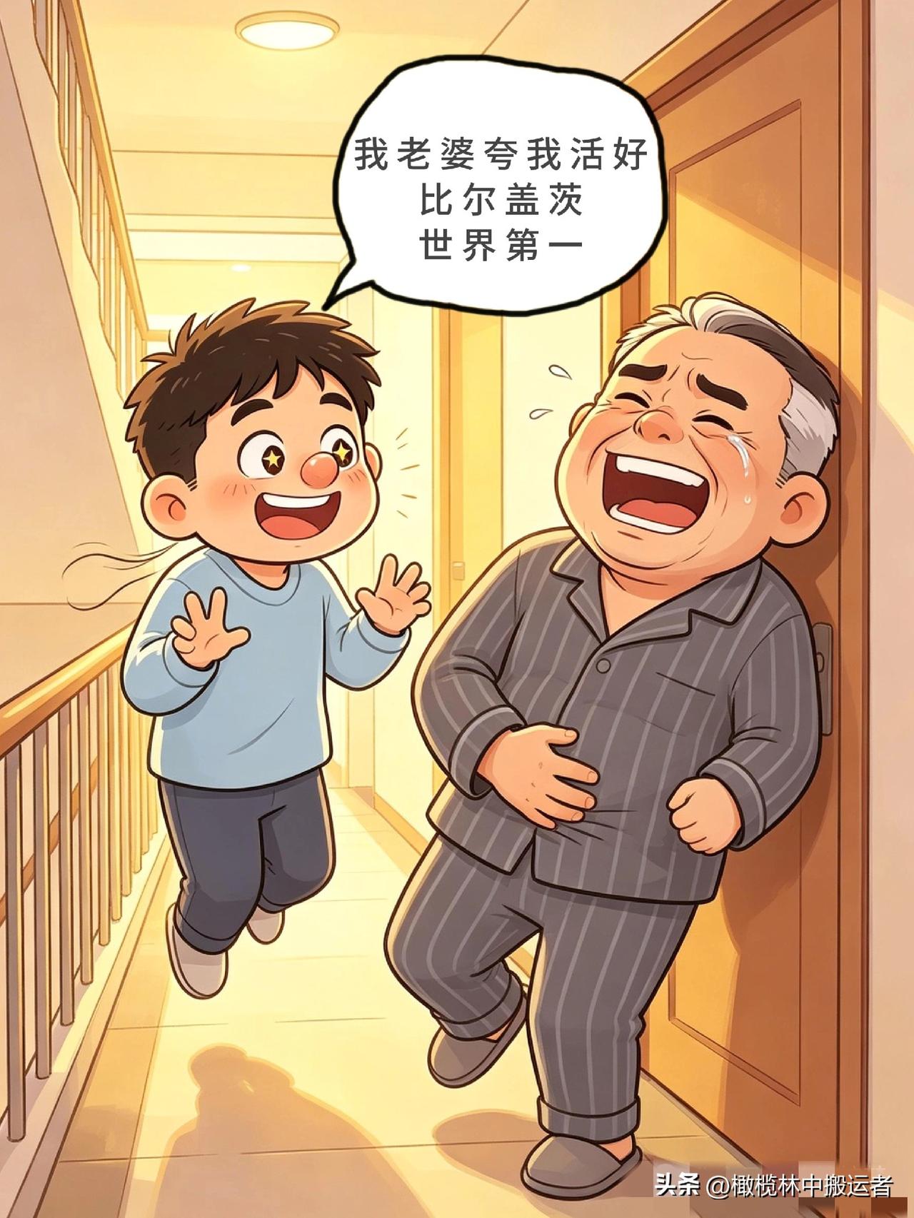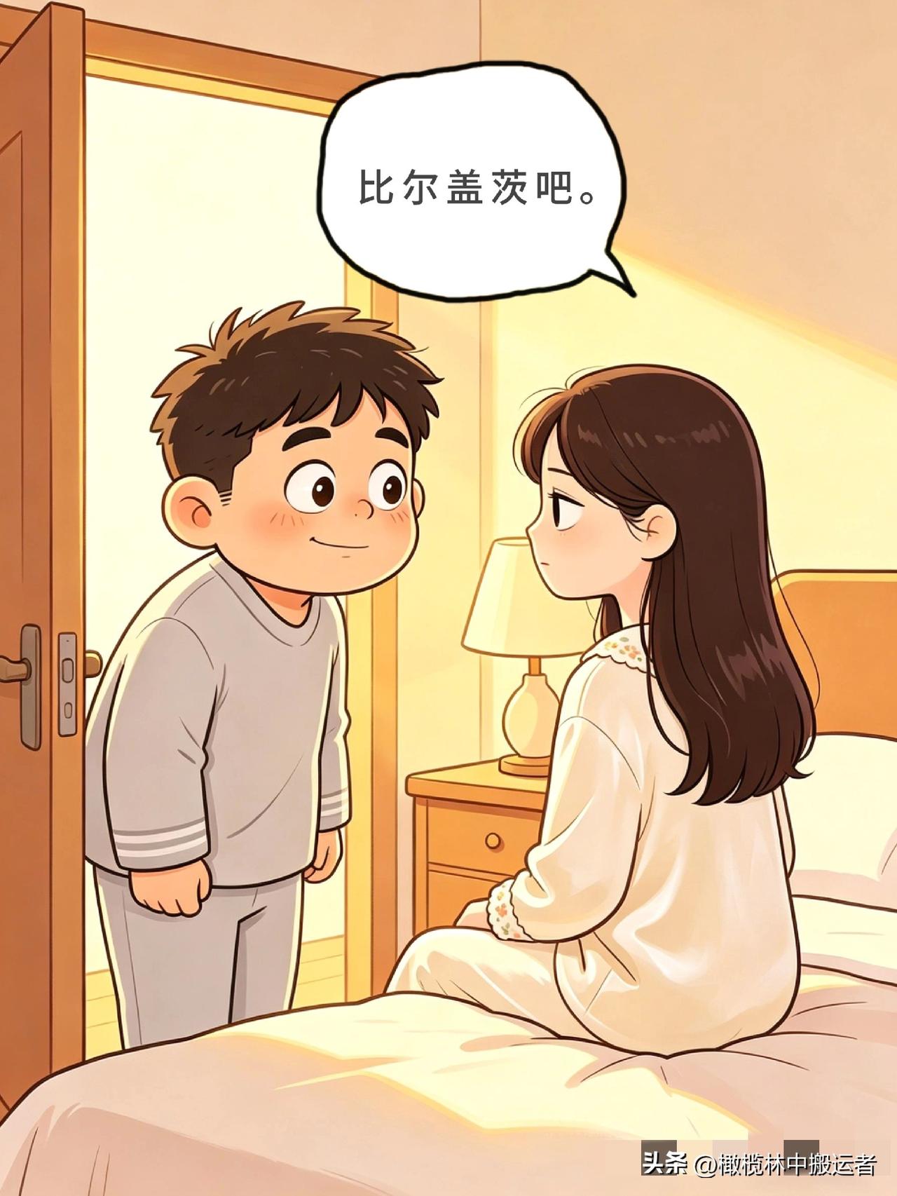 趣味漫画:新婚次日,小陈问妻子昨晚感受,妻子答“比尔盖茨”。他向邻居炫耀,邻居: