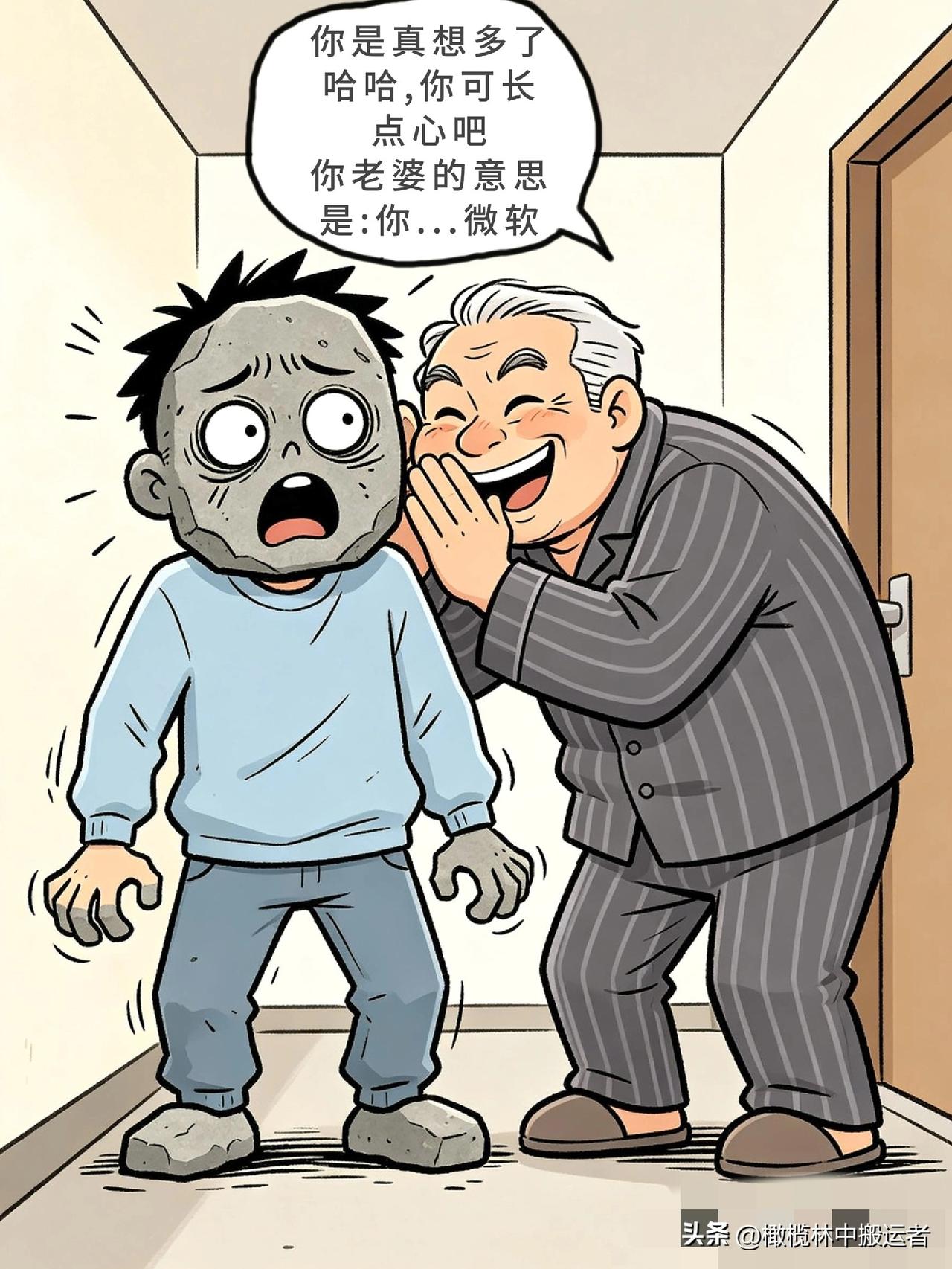 趣味漫画:新婚次日,小陈问妻子昨晚感受,妻子答“比尔盖茨”。他向邻居炫耀,邻居:她是说你微软。夫妻日常漫画 婚后趣味对话