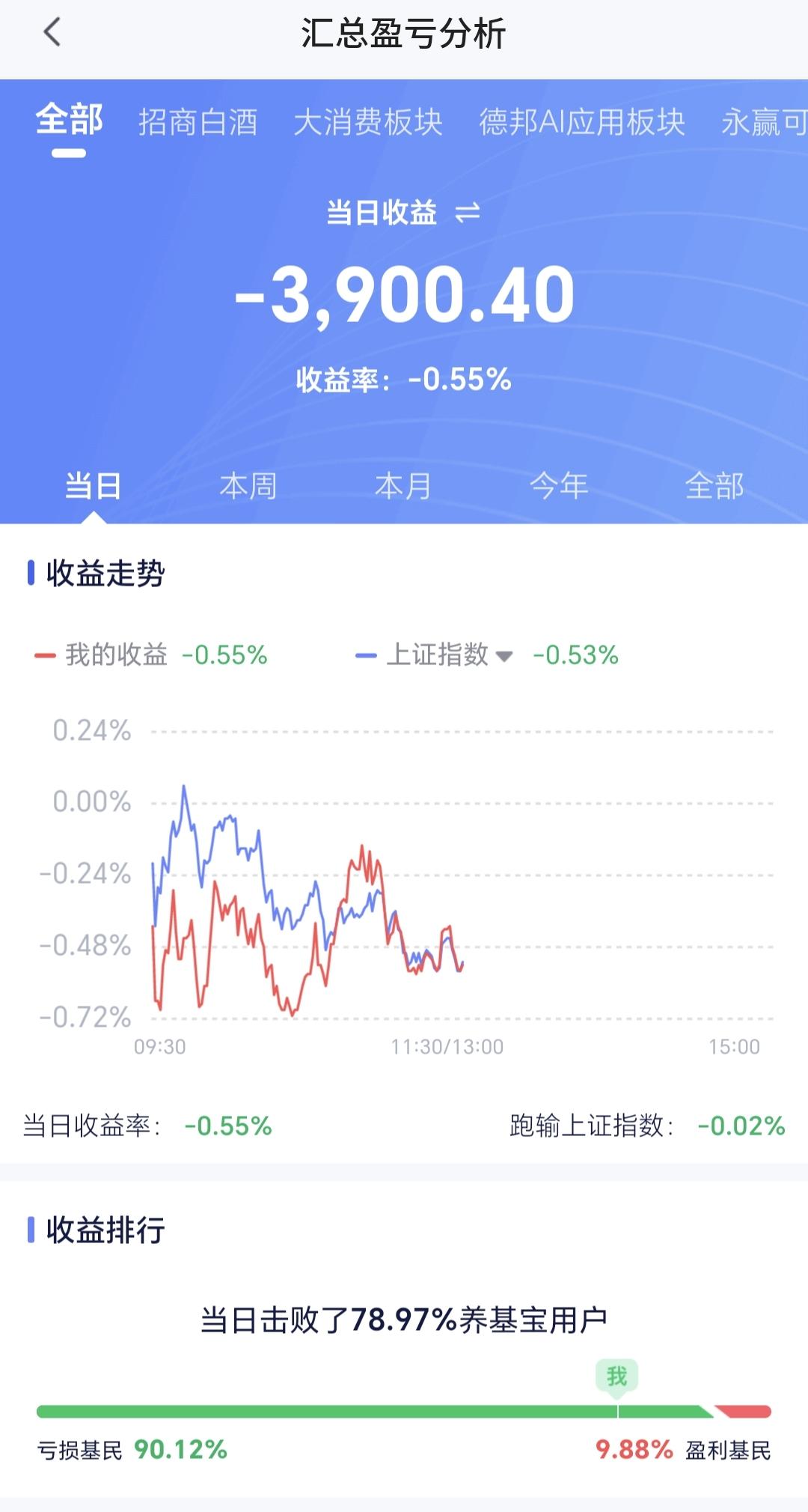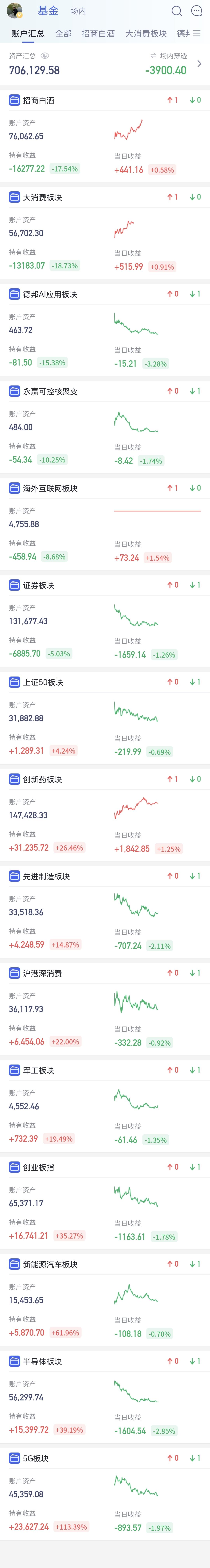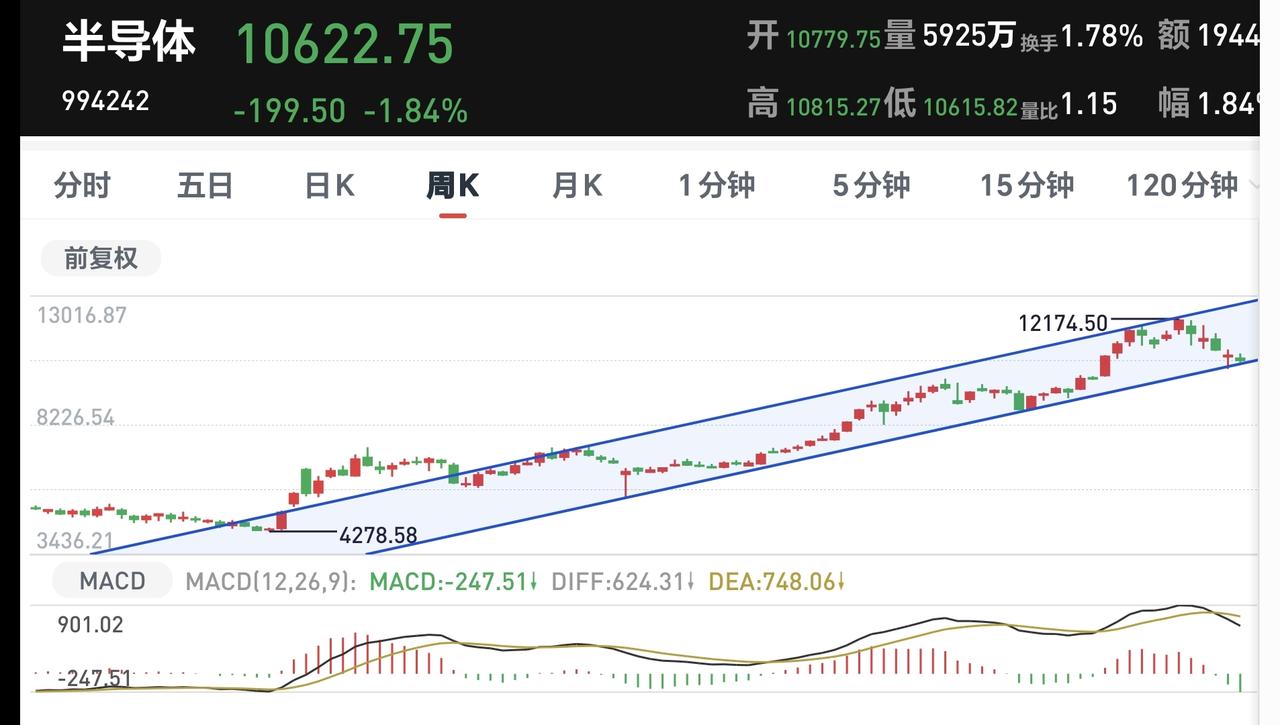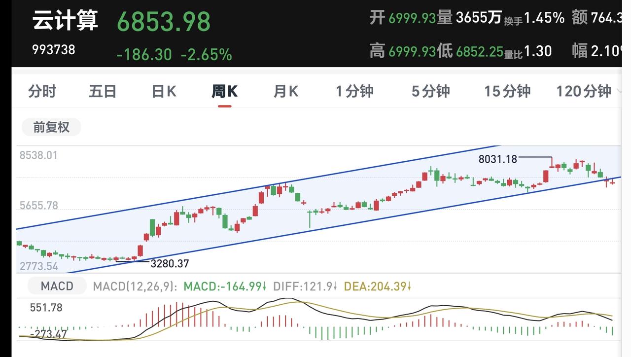 基金:半导体板块,半导体材料设备板块,云计算板块 今天下跌幅度最大的三个板块是:半导体材料设备板块,云计算板块,半导体板块。 半导体材料设备板块下跌幅度最大,盘中估值下跌了3.47%,持有人数在所有板块当中排名第14位。 半导体材料设备板块日线级别处于下跌通道中,最近一段时间都是在这个下跌通道中震荡,在这个板块日线级别下跌趋势被改变之前,都不要轻易判断这个板块的下跌趋势会被改变。 半导体材料设备板块上周下跌跌破了周线级别上涨通道的下轨线,这个板块的周线级别上涨趋势已经被改变,本周是在这个上涨通道的下方震荡,在重新回到这个周线级别上涨通道内之前,都不要轻易判断这个板块的调整已经结束。 半导体板块今天下跌幅度排名第二,盘中估值下跌了2.77%,持有人数在所有板块当中排名第九位。 半导体板块日线级别处于短期下跌通道中,最近一段时间也是在这个下跌通道中震荡,在上涨突破这个下跌通道上轨线之前,都不要轻易判断这个板块的调整已经结束。 半导体板块周线级别处于上涨通道中,今天下跌以后来到了这个上涨通道下轨线上,近期观察会不会有效破位这个上涨通道的下轨线,如果实现了有效破位,长线持有的人也需要注意风险。 云计算板块今天的下跌幅度排名第三,盘中估值下跌了2.73%,持有人数在所有板块当中排名第50位。 云计算板块日线级别处于下跌通道中,今天的下跌跌破了这个下跌通道的下轨线,进入了加速下跌走势,短线持有的人需要注意风险。 云计算板块周线级别上周下跌跌破了上涨通道的下轨线,本周是在这个上涨通道的下方震荡,这个板块周线级别的上涨趋势已经被破坏,长线持有的人需要注意风险。 今天中午收盘的时候,主力资金净流出498亿,指数在上下震荡的过程当中,主力资金无视指数的涨跌,都是在出逃当中,下午继续观察反弹的过程中有没有资金进场。 再看一下下面的截图9,再强调一下观点:虽然今天上午是下跌的,但还没有确定现在就是在走五浪下跌,确定五浪下跌的标准是近期不创3955点新高,哪怕是盘中上涨突破3955点也不行。 持有基金现在盘中估值亏损了3900元,盈利金额最大的三个板块是:创新药板块,大消费板块,白酒板块,亏损金额最大的三个板块是:证券板块,芯片半导体板块,创业板指,持有基金的涨跌幅度见下面的截图13。 许多人只能接受上涨,接受不了下跌,许多人只能接受利好消息,接受不了利空消息,这些人的思维方式都是有问题的,我们无所谓市场的利好和利空消息,也无所谓市场的上涨和下跌,我们只要把自己的应对策略做好就可以,需要知道上涨了应该怎么办,也需要知道下跌了应该怎么办,因为,这才是我们能够做到的,至于市场的上涨和下跌,市场的利好和利空消息,那些都是我们决定不了的事情,操心那些事情就是徒增烦恼。 到现在为止,我们还是做好两手准备,如果上涨趋势形成了,我们就会追涨进场。如果继续调整到达前低的附近,我们就会抄底进场,我们现在就是在等待市场的确定性,这个市场的确定性还没有到来之前,我们就只能是观望。 当市场有了确定性以后,我会第一时间分享给大家,大家帮忙评论点赞,转发和分享,谢谢大家的支持。
