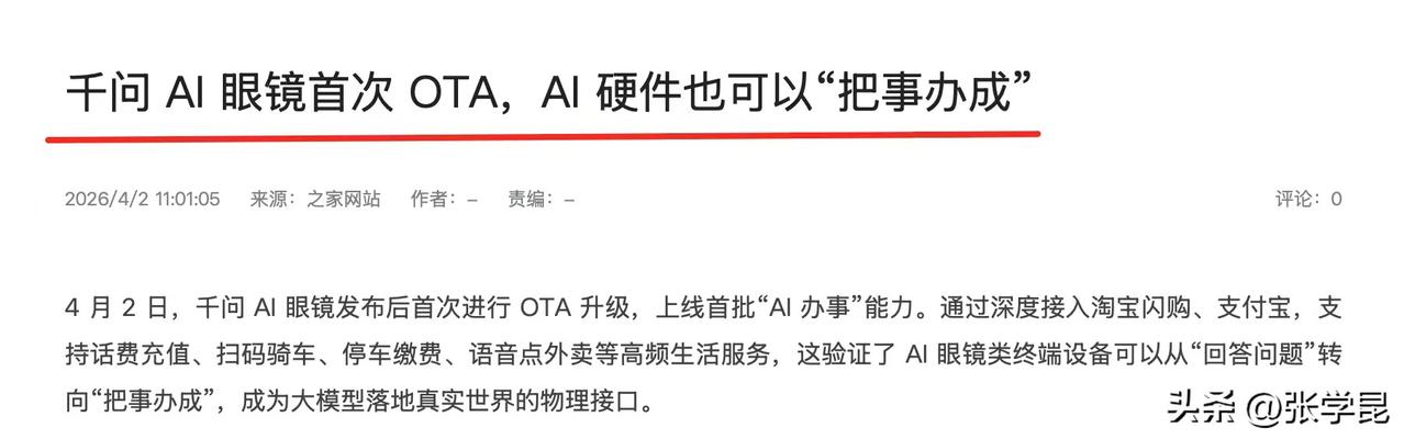 美国AI落地成空谈,千问眼镜的办事能力,蕴含着中国五千年的智慧! 美国知名科技媒体The Information发布报道称,中国的阿里巴巴在AI办事领域的进展已经领先亚马逊和OpenAI。 不得不说,外媒对于中外这个AI应用的速度判断还是非常准确的。 这不,最近千问AI眼镜进行OTA升级之后,也拥有了强大的办事能力。现在通过千问AI眼镜,可以实现“一句话”,停车缴费、在线点外卖、话费充值等办事能力。 就拿这个点外卖来说,很多人忙的时候点外卖根本没时间看手机。现在通过AI眼镜的办事能力,一句话就能搞定外卖,解放双手的同时,还能节省时间。 而且在等待外卖的过程中,还能实时查询进度,问千问AI眼镜,它就能语音播报外卖进度。 再比如这个停车缴费的功能,很多时候车开到出口了,会出现扫码不准确,信号不给力等问题,现在通过千问AI眼镜,直接就能语音指令完成缴费。 从千问AI眼镜办事能力覆盖的这些场景,估计大家也能看到,未来千问AI的办事能力,会通过千问AI眼镜这个硬件窗口,覆盖生活的方方面面。 为什么说这个事儿蕴含着中国五千年文化智慧底蕴呢? 古人云,“谋定而后动”,意思就是做事之前要有周密的思考,分析好客观条件。千问AI眼镜能有今天的办事能力,就是基于千问AI助手在春节活动中取得成功,阿里拥有成熟生态,背靠中国丰富多样应用场景。 所以综合来看,AI应用一定是中国领先,千问AI眼镜充当了先锋的角色!也相信在千问AI眼镜的带领下,未来国内会有更多拥有办事能力的硬件产品!