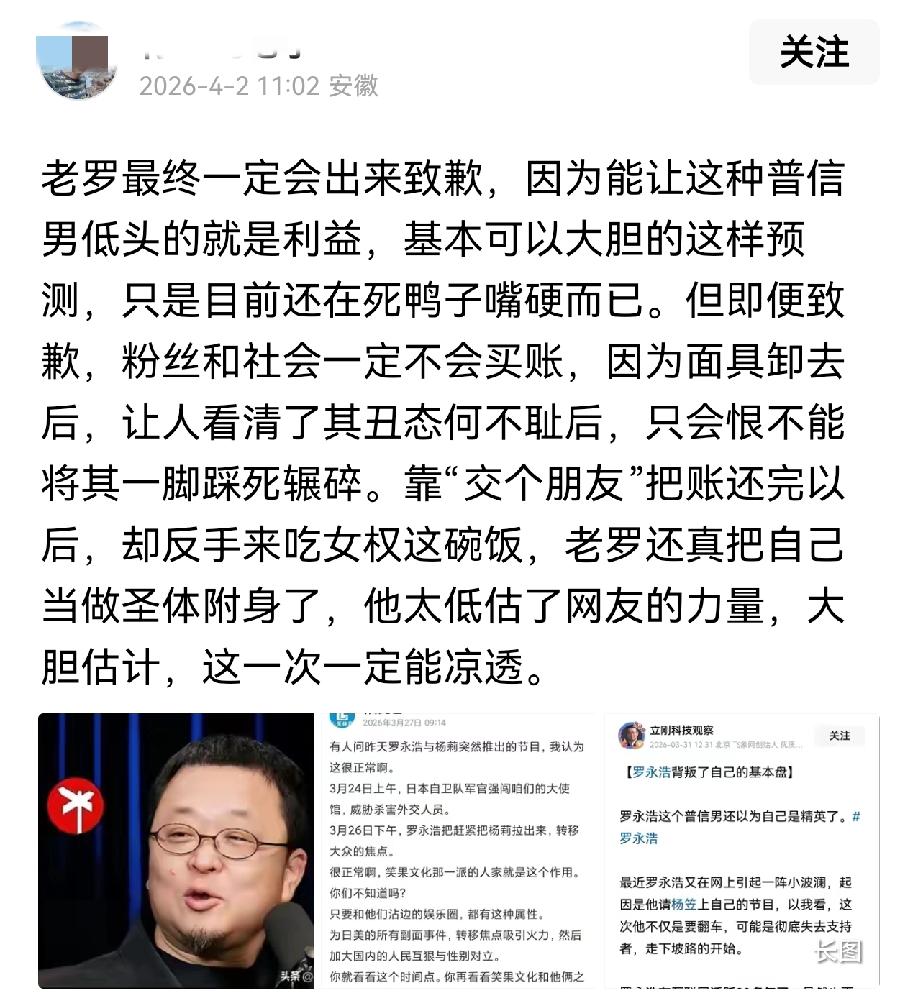 罗永浩绝对不会道歉! 刚刷到一篇文章,说罗永浩力挺杨笠,最终会以道歉收场!他的理由是,为了利益!因为罗永浩这样停杨笠导致很多人反感他,脱粉,间接导致他利益受损。所以,为了利益,他最终会道歉! 我觉得是想多了,罗永浩这个人,本来就不是会低头的人,更不是会顾及大众情绪的人。 而且从目前他的操作来看,也已经证明了这一点。他不但继续怼网友,还成了“拉黑办”,就说明了他不会低头,不会认错。为什么?因为他从来不觉得自己有错! 一个早年公开说自己是“精日”、把日本当精神故乡的人,本身就没什么底线可言。在他眼里,流量和立场永远比大众感受重要,只要他认定的事,哪怕得罪全网、被骂翻天,他也不会认。 他这次邀请杨笠之前,就有人劝他不要请,但是他依然我行我素。他不在乎别人怎么看,更不会因为被骂就反省。指望他道歉?根本不可能。 这种人,从根上就不值得好感,更别指望他会有半句软话。