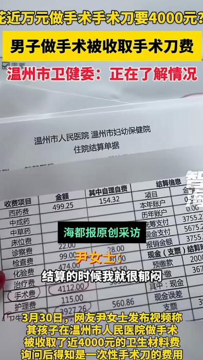 浙江温州,一女子的儿子在医院做手术,一共花9430.53元,结算时,女子发现有3927.26元的材料费,她问医院这是啥费用?对方回复说“是一次性手术刀”,女子怒了:凭啥做手术前不告知家属?我同意用了吗?医院不提供手术刀,难道让我们自己带? 尹女士的儿子才十岁,原本活泼好动,但最近一年却变得越来越没精神。晚上睡觉鼾声如雷,甚至会突然停住呼吸,几秒后猛地吸一口气,把她吓得整夜不敢合眼。 白天上课总打瞌睡,成绩也直线下降,老师多次提醒她带孩子去检查。 在反复犹豫之后,尹女士带着儿子去了医院。经过一系列检查,医生给出了一个让她心头一紧的诊断——阻塞性睡眠呼吸暂停综合征,而且已经影响到孩子的生长发育,必须尽快手术。 “只是个小手术,把扁桃体和腺样体处理一下就好。”医生语气轻松地安慰她。 尹女士虽然紧张,但为了孩子,只能点头同意。她反复问费用问题,医生简单说:“费用不算太高,大概几千块钱。”具体项目并没有细说。 几天后,孩子恢复得不错,呼吸明显顺畅了,夜里也不再憋醒。尹女士心里既庆幸又感激,觉得这钱花得值。 直到出院结算那一刻,她的心情突然变了。 收费窗口递来一张长长的清单,总费用是9430.53元。她本来已经做好心理准备,可当目光扫到其中一项时,眉头一下皱紧——材料费:3927.26元。 “材料费这么贵?”她忍不住问收费员。 收费员头也不抬:“具体可以去问医生。” 尹女士带着疑问找到科室护士,护士看了一眼,说:“这个是一次性手术刀和相关耗材。” “一次性手术刀?”她愣住了,“一把刀要三千多?” 护士解释得很含糊:“不只是刀,还有配套的一次性器械包。” 尹女士越听越不对劲,语气也提高了几分:“那为什么术前没人告诉我?这么贵的材料,你们用之前不需要家属同意吗?” 旁边的医生听到动静走了过来,语气有些不耐烦:“这是常规手术配置,都是为了安全和无菌操作。” “常规就可以不告知吗?”尹女士反问,“我签的手术同意书里,哪一条写了要用三千多的刀?你们有没有给我选择?” 医生皱了皱眉:“现在的手术基本都用一次性器械,这是行业标准。” “那你们医院有没有其他选择?比如便宜一点的?”她紧追不放。 医生沉默了一下,说:“理论上有,但不推荐。” 这句话让尹女士一下子火了。 “既然有选择,为什么不提前说?你们直接用了最贵的,然后让我买单?这算什么?”她声音越来越大,引来不少人侧目。 她越说越委屈:“如果你们不提供手术刀,难道让我自己去买?可你们既然提供,就应该提前讲清楚价格、种类,让家属决定!不是你们说用什么就用什么!” 现场气氛一度僵住。 有病人家属在旁边小声议论:“这种情况挺常见的,很多材料费都不提前说。”“是啊,等结账才发现贵得离谱。” 护士试图打圆场:“您先别激动,我们可以帮您解释一下具体明细。” 但尹女士已经很难冷静下来。她拿着清单,一项一项地看,越看越觉得心里不踏实。那些看不懂的专业名词,在她眼里全变成了无法掌控的费用。 “我不是不愿意给孩子花钱,”她的声音有些发抖,“但我有知情权,有选择权。你们不能什么都不说,等用完了再让我承担。” 她要求见医院的负责人,并表示如果解释不清楚,就要投诉。 事情很快引起了院方重视。一名医务科工作人员出面沟通,态度相对缓和,表示会核查收费是否合理,同时解释说,一次性手术器械确实成本较高,但在使用前,医生应当履行告知义务。 “如果存在告知不到位的情况,我们会进行整改。”工作人员说道。 但这番话,并没有完全平息尹女士的情绪。 这件事很快在医院内部引发讨论,也被一些家属传到了网上。有人支持医院,认为安全第一,贵一点可以理解;也有人站在尹女士这边,认为知情权和选择权不该被忽视。 而对于尹女士来说,这不只是一次费用争议,更是一堂让她刻骨铭心的“现实课”。