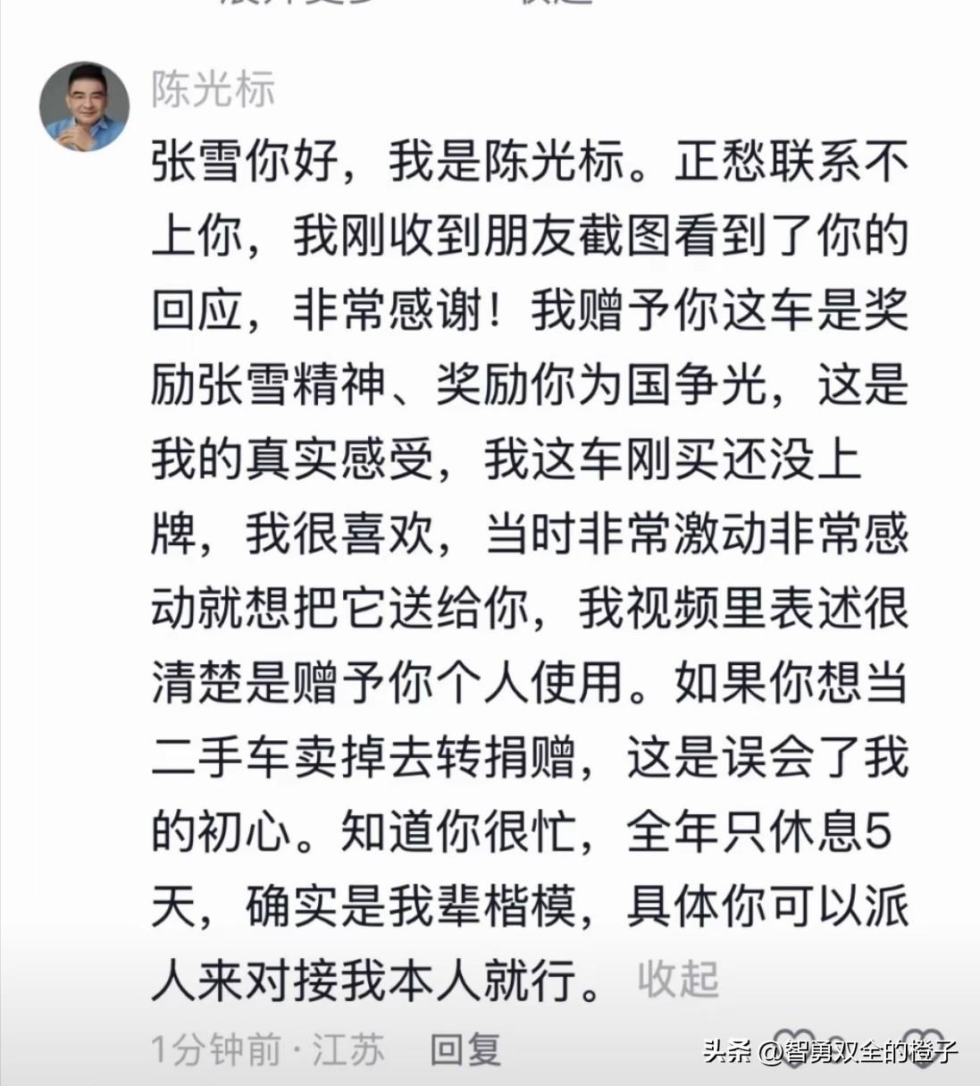 现在最纠结人应该就是陈光标了,答应送张雪的劳斯莱斯,没想到,却翻车了! 张雪夺冠后,标哥发视频说,为了表彰张雪为国争冠的事迹,他决定将公司买的最新款劳斯莱斯送给张雪。 张雪随后回应说,如果真的要送车给他,他就把车卖掉,卖车的钱捐给嫣然医院! 看到张雪的回应后,标哥先在评论区回复说,他的本意是想把车给张雪个人使用,不想让张雪把车卖掉! 不过,标哥很快就把这条评论删除了,然后说这车还没上牌,不过既然答应送车,怎么处置就是张雪的事,要捐出去他也支持,让张雪主动联系他。 送车也不实际,新车就变成二手车了,要不标哥直接投资张雪机车,这样两全其美,大家觉得呢?