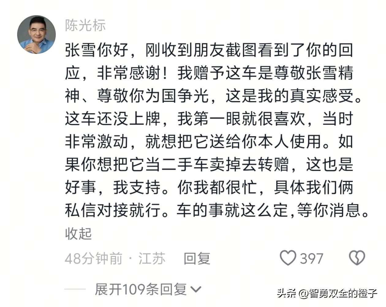 现在最纠结人应该就是陈光标了,答应送张雪的劳斯莱斯,没想到,却翻车了! 张雪夺