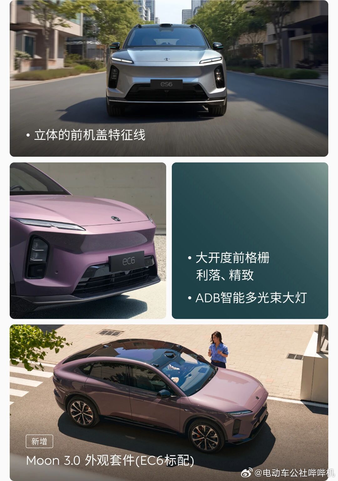 新款蔚来ES6、EC6,外观升级全新套件,并升级配置:新增主驾零重力座椅、标配后排舒享套装、新增两个磁吸点位,标配小蓝灯。