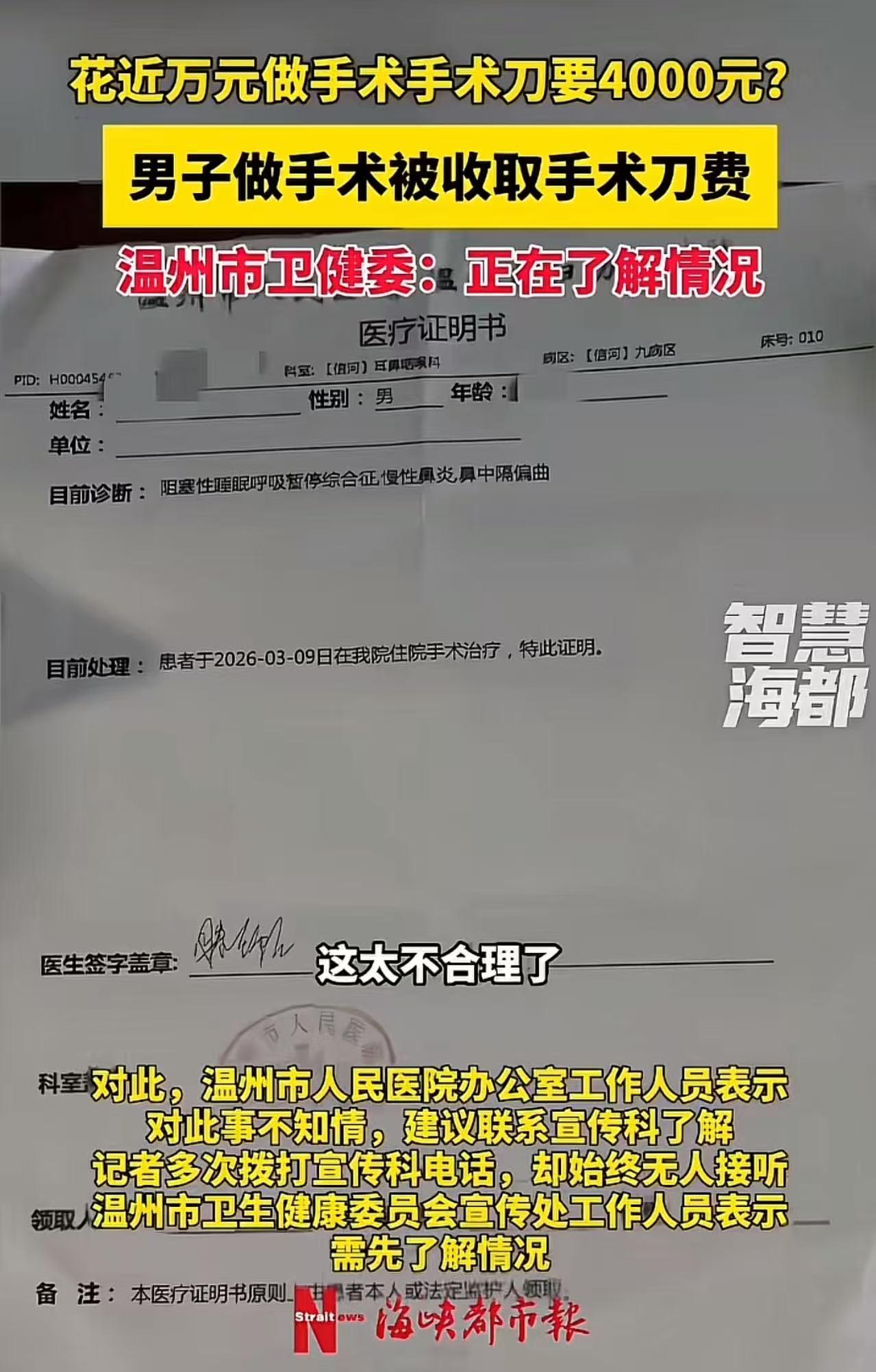 “孩子花近万元做手术,手术刀要4000元?”孩子妈妈:“已经给了手术费了,还收手术刀的费用,怎么可以要别人自己带刀呢?”网友炸锅! 温州的尹女士怎么也没想到,一场看似普通的鼻部手术,竟让她在结账时“破防”了。 3月29日,尹女士的儿子在温州市人民医院做完鼻中隔偏曲矫正手术后,拿着结算单的她一脸震惊。 手术费4112元,这她能理解,可旁边赫然列着一笔3927.26元的“卫生材料费”,占总费用近四成! 尹女士当场就懵了,赶紧问护士:“这材料费是什么?怎么这么贵?” 护士轻描淡写地回了一句:“哦,那是一次性手术刀的费用。” “手术刀?” 尹女士彻底炸了,“我交了4000多手术费,怎么还要单独买刀?这就像去餐厅吃饭,点了400块的菜,还要再付400块给厨师买锅和勺,这合理吗?” 原来,尹女士的儿子因长期鼻塞、打鼾,被诊断为阻塞性睡眠呼吸暂停综合征,医生建议手术。 术前沟通时,只说了手术费,没人提过“手术刀”还要额外收费,更没人说这把刀要近4000块。 直到结账时,这笔“隐形消费”才浮出水面。尹女士质问医院:“手术刀不是医生的工具吗?怎么让患者买单?”院方却回应:“这是一次性刀具,其他病人也这么收。” 尹女士不服,认为医院术前未履行告知义务,剥夺了患者的选择权,于是选择投诉。目前,温州市卫健委已介入调查。 网友热议 “手术刀现在是一次性的,不像40年前蒸汽消毒后重复使用!就像打针需要付费购买针头一样!” “所以一把一次性的手术刀价格能占比到整个手术费的40%……这是镀金的?合理吗?” “我是医生,这收费很正常,不同的手术方式要用不同的手术刀,有等离子的,有射频的,有超声的,价格是由医保定价,跟医院没关系,医院只是执行!” “超声刀都是几千块,厂家为了利润最大化,不允许复消,只一次性使用。医院消毒也会占用大量成本,所以这样的情况就顺理成章了,反正患者出钱!” “最气的是术前不说,术后结账才知道,这不就是‘宰客’吗?至少告诉我们有选择啊!” 这事儿的核心,从来不是“手术刀该不该收费”,而是“患者有没有选择权”。 现代医疗确实离不开高精尖的耗材,进口一次性手术刀可能有其技术优势,但近4000元的价格,这合理吗? 更关键的是,医院在术前从未提及这笔费用,直到术后才算账,这无异于“先斩后奏”。 《民法典》明确规定,医务人员实施手术应及时说明医疗风险、替代方案等,取得患者或家属明确同意。国家医保与卫健部门也多次强调,单独收费的高值医用耗材必须术前明确告知名称、价格、替代方案并签署同意书。 医院用“一次性刀具、统一收费”搪塞,本质上是利用医患信息不对称,剥夺了患者的知情权和选择权。 患者不是“待宰的羔羊”,医疗收费更不能玩“暗箱操作”。 如果医院术前坦诚告知:“这把进口手术刀4000元,效果好但贵;国产刀几百元,效果稍逊但便宜”,让患者自己选,还会有这场纠纷吗? 医疗的本质是“以人为本”,不是“以费为本”。手术刀要精准,收费更要透明。别让一把“天价刀”,割裂了医患之间最基本的信任。