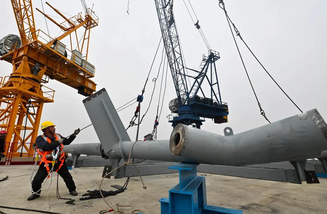 天津117大厦近在做顶部的钻石💎冠部,工作人员正在吊装顶上钻石形装饰的钢材框架