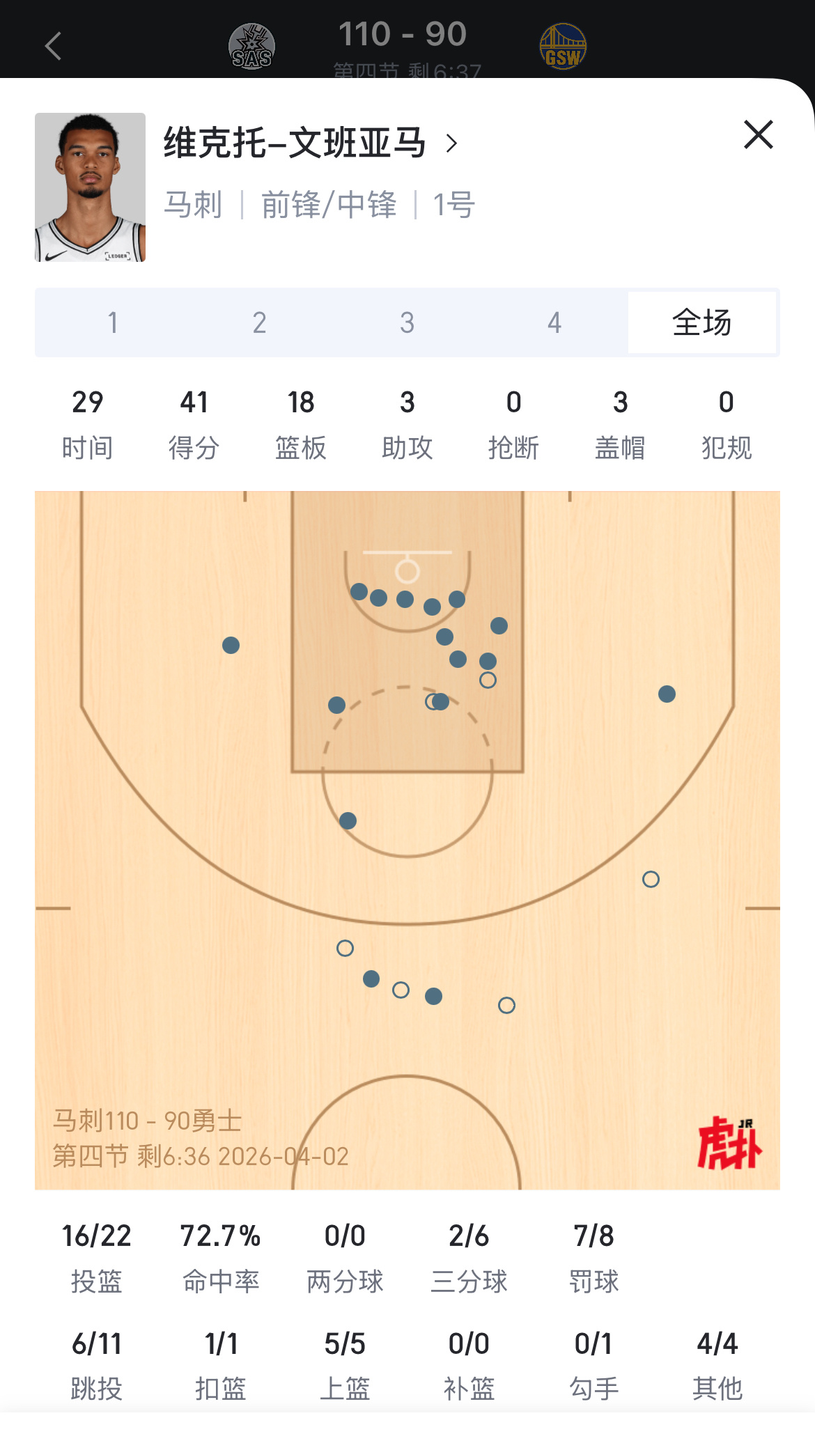 文班亚马对勇士29分钟轰下41分18板,72.7%命中率!连续两场比赛40+🔥