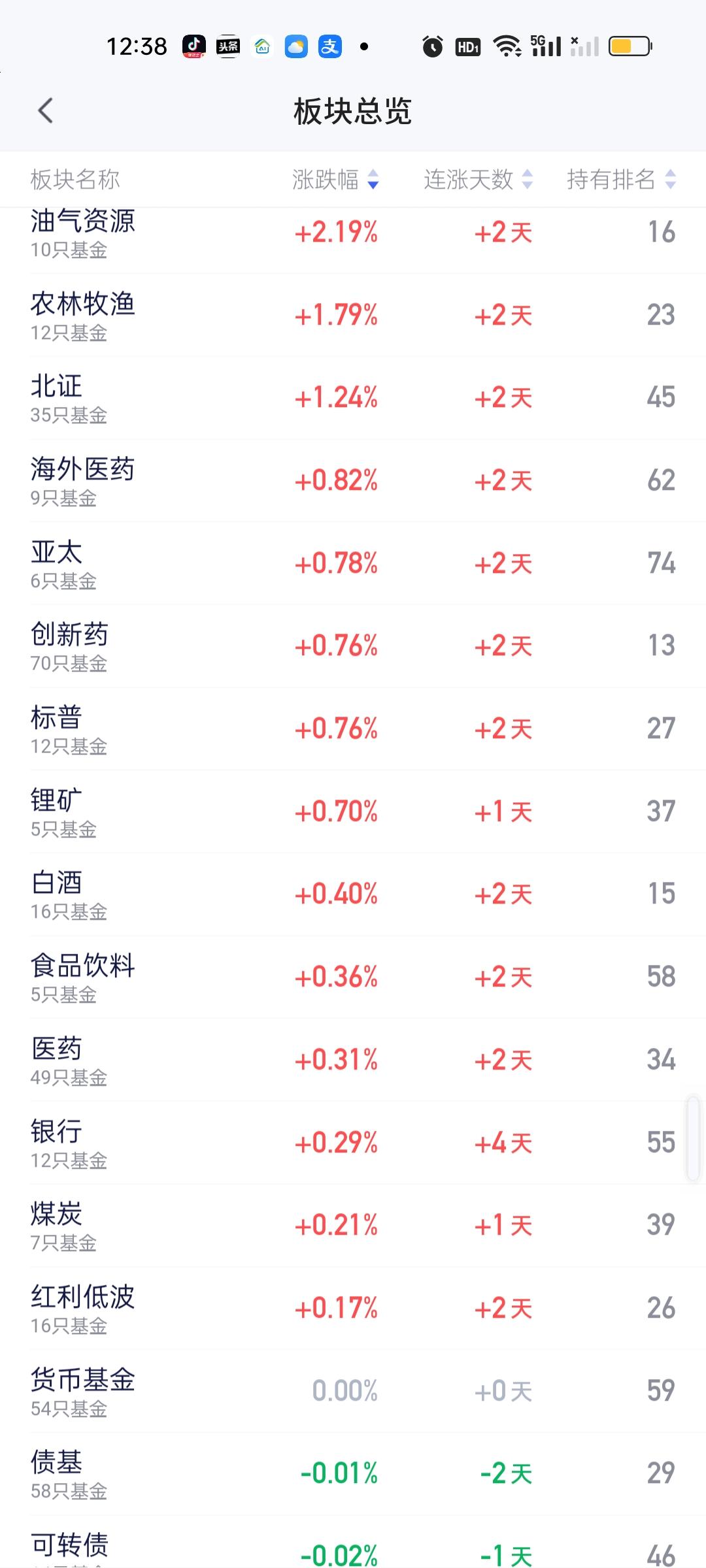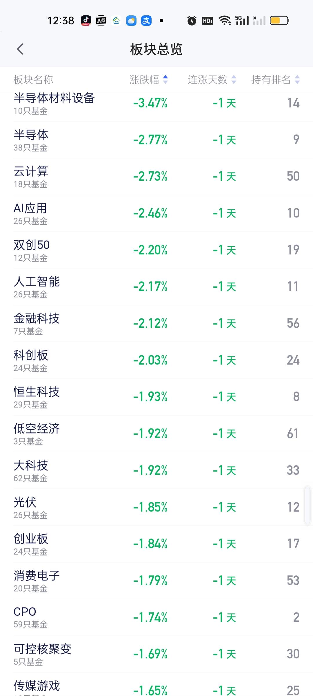 上午上涨的板块并不多,涨幅最大的板块是油气资源,涨2.19%,但下午很有可能会大涨,因为外围原油涨得厉害。此外农林牧渔,北证涨幅也在1%以上。其它上涨的板块涨幅都不大。 跌幅方面,半导体材料设备大跌3.47%是上午跌幅最大的板块,跌幅靠前的板块还有半导体,云计算,AI应用,双创50,人工智能,金融科技,科创板。恒科,低空经济,光伏,消费电子,CPO,可控核聚变,传媒游戏等。