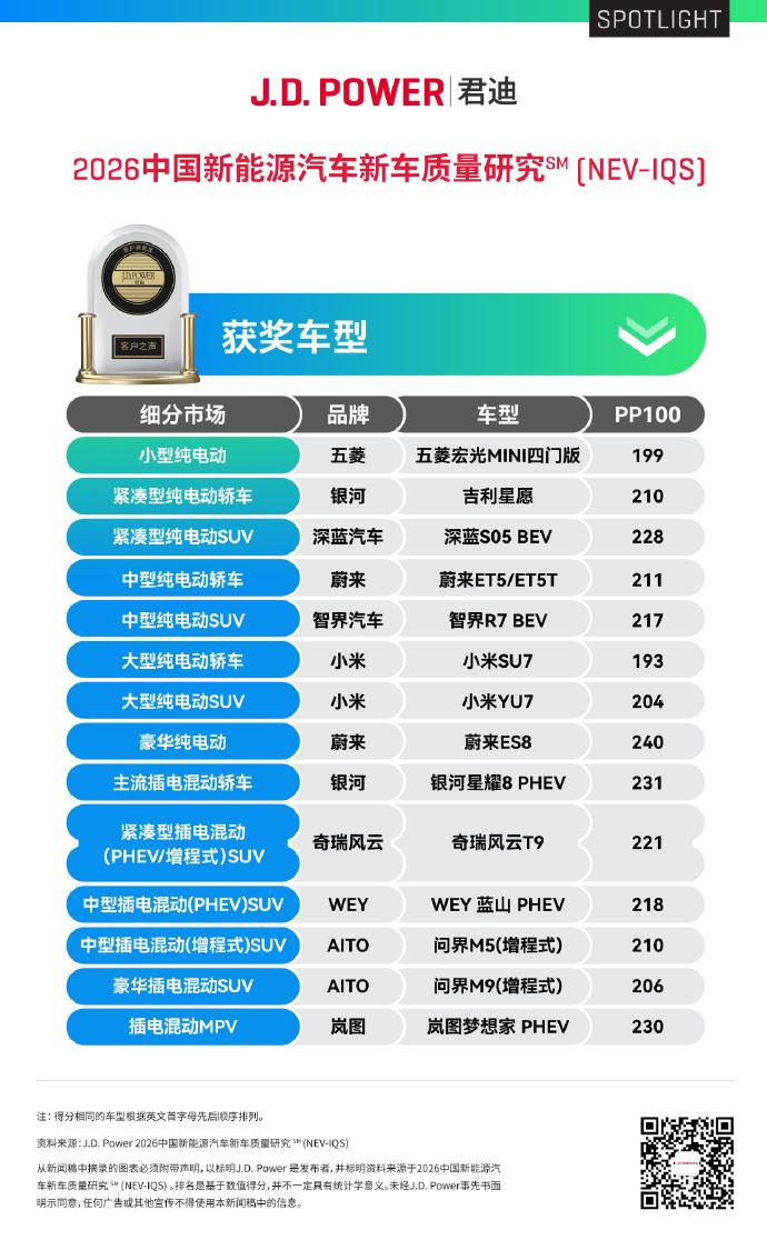 J.D.Power都知道吧?刚发布的2026中国新能源汽车新车质量研究榜单,小米SU7和YU7拿下各自细分市场冠军,以真实车主作为调研基础,得到数值越低,抱怨越少,品控越优秀! 不仅如此,SU7和YU7曾在各自细分市场还曾拿下J.D. Power “产品魅力指数”冠军!质量+魅力双重冠军都被小米SU7和YU7拿下,可见品质和设计都得到了大家的认可! 尤其是质量这块,初代SU7、新一代SU7、小米YU7都有拆车,做工和用料都看得见,网友严选好车,车质网在去年发布的报告中,小米YU7也是第一,这质量确实够硬核[吃瓜群众]